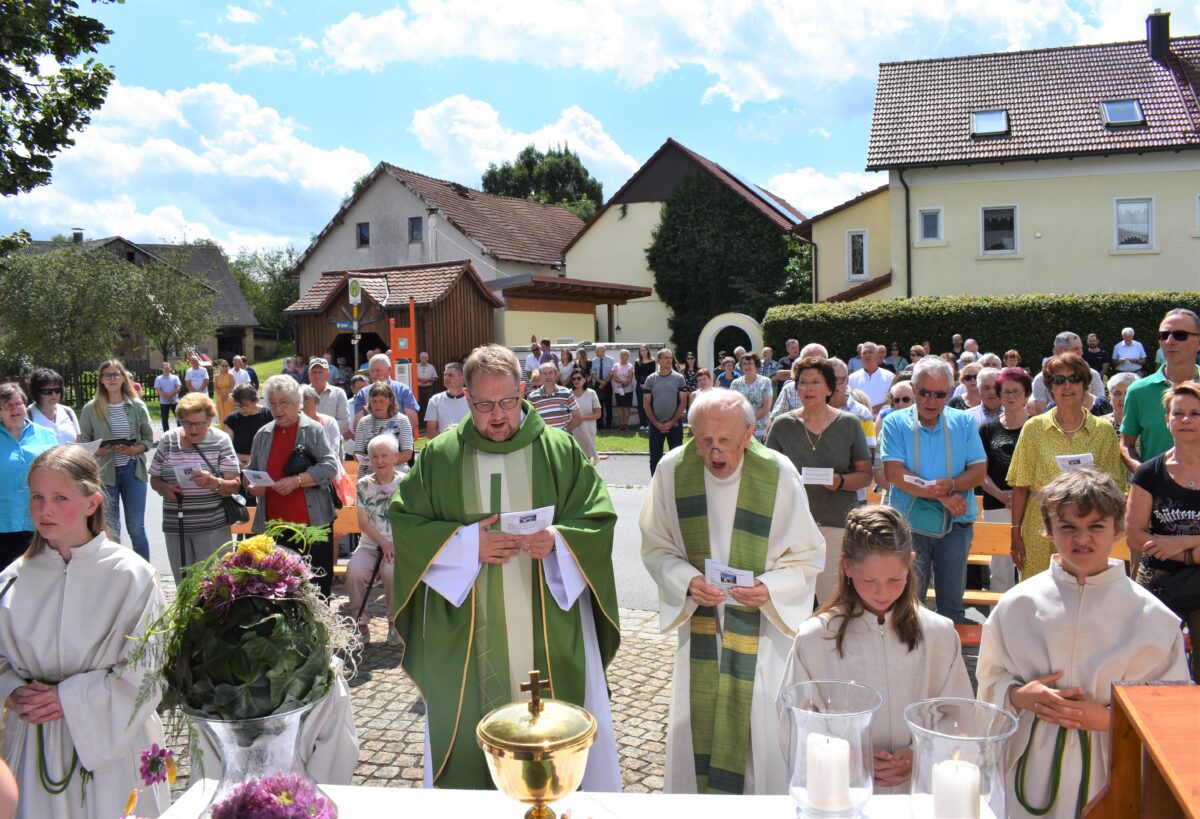 “40 ist eine biblische Zahl; 40 Jahre zog Israel auch durch die Wüste ins gelobte Land. Seit 40 Jahren gibt es die Michaelskapelle in Gößenreuth, wo sich die Menschen zum Beten treffen”, so Pfarrer Daniel Fenk bei der festlichen Messe, die er im Freien vor der Kapelle zusammen mit Ruhestandspfarrer Hans Bayer zelebrierte.