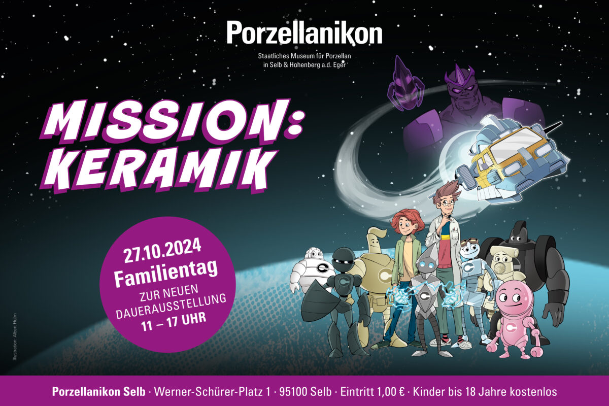Die Macherinnen und Macher des Porzellanikons gehen dabei völlige neue Wege, um den spannenden Werkstoff mit seiner langen Geschichte und vielversprechenden Zukunft zu präsentieren. Die Erlebnis-Ausstellung „MISSION: KERAMIK“ im Comic-Stil richtet sich an Besucherinnen und Besucher jeden Alters, der Fokus liegt aber auf Kindern und Jugendlichen ab zehn Jahren.