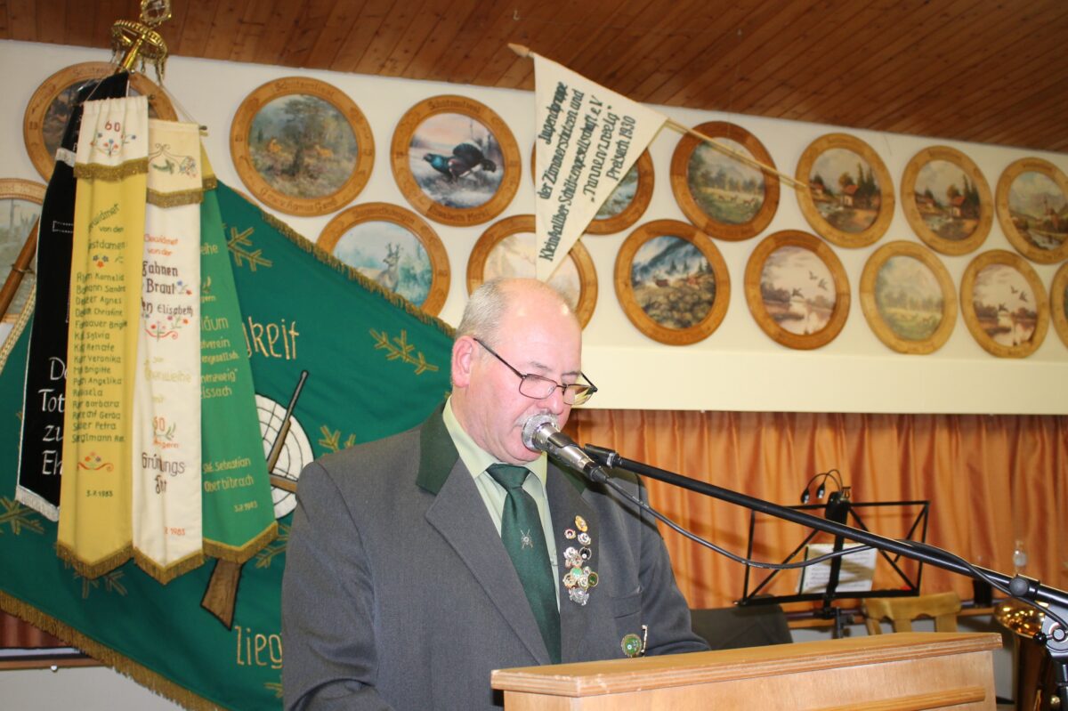 Die wichtigsten Etappen der Vereinshistorie zeichnete Schützenmeister Hans Hey nach – angefangen mit der 1923 vollzogenen Gründung der „Zimmerstutzen- und Kleinkaliber-Gesellschaft“, die 1930 ihr erstes Schützenheim beim Anwesen Schwemmer (später: Lehner) einweihte. Im selben Jahr wurde auch der erste „Wimpel“ gesegnet. Drei Jahre später kamen die Nationalsozialisten an die Macht, und im zunehmend totalitär strukturierten „NS-Staat“ wurden auch die Schützenvereine „gleichgeschaltet“. Vor allem die Parteimiliz SA habe in den folgenden Jahren empfindlichen Einfluss auf das Vereinsleben genommen, und 1938 hätten die Sportschützen schließlich „die Waffen gestreckt“, ihren Verein aufgelöst und das Schützenheim versteigert, erinnerte Hey.