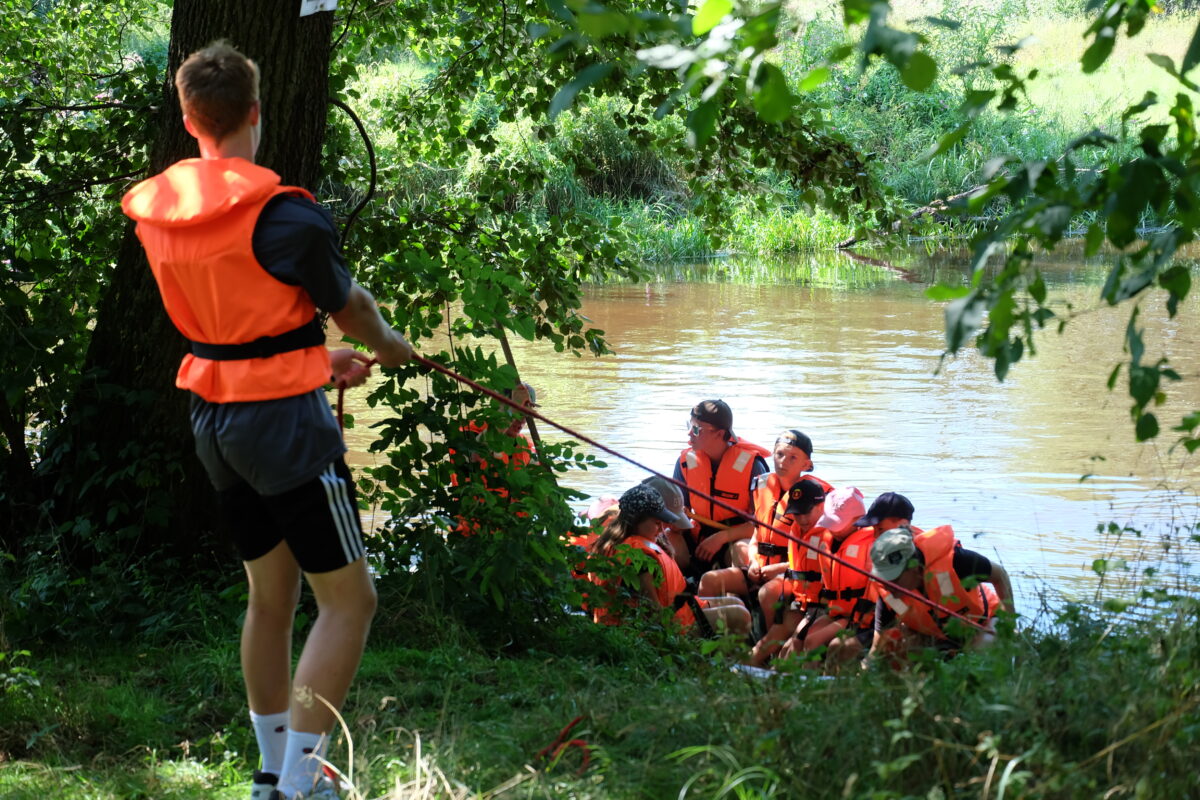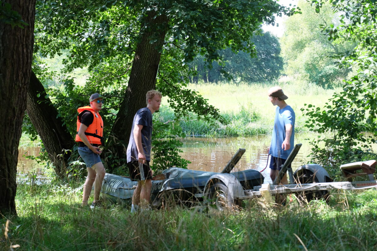 Weit unterhalb der Kläranlage hatte die Feuerwehrleute schon Tische und Bänke im Schatten der Bäume am Wasser aufgestellt. Für die angebotenen Aktivitäten, während der Wartezeit der fast 30 Jugendlichen, mussten trotzdem noch Pavillons zum Schutz der prallen Sonne hergerichtet werden. Das Schlauchboot vom THW wurde zu Wasser gelassen und bei jeder Fahrt von vier Feuerwehrleuten mit Paddeln etwa 800 Meter flussabwärts bis kurz vor Sperlhammer gesteuert. Der Plan, den Weg auch wieder zurück zu paddeln, scheiterte leider an der starken Strömung. Aufgrund der Regenfälle der letzten Wochen und des deshalb erhöhten Wasserstandes war es nicht möglich dagegen anzukämpfen. Somit musste das Schlauchboot nach jeder Fahrt wieder aus dem Wasser gezogen und mit den Kindern wieder zum Startpunkt zurückgebracht werden.