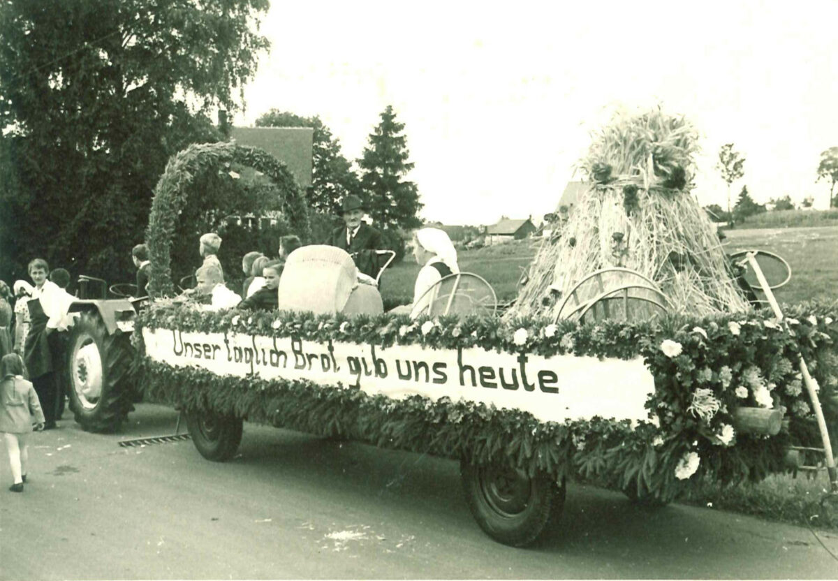 Noch nach dem Zweiten Weltkrieg wurden die Garben auf hölzernen, eisenbereiften Wagen heimgefahren. Zwei Aufgeber stachen die Garben mit der Gabel auf den Wagen, zwei Aufleger schichteten sie so, dass die Ähren zueinander zeigten. Wurde das alles nicht ordentlich gemacht, rutschte die ganze Fuhre auf den holprigen Wegen auseinander – ein peinlicher Moment, der nicht nur Mehrarbeit, sondern auch den Spott der Nachbarn einbrachte.