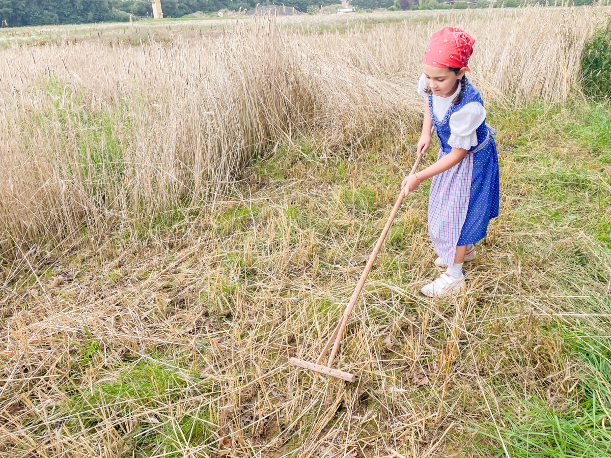 Besonders eifrig dabei war die erst achtjährige Hannah Weidner. Mit geflochtenen Zöpfen und einem passenden Kleid, wie es Mädchen vor langer Zeit auf dem Feld und im Alltag trugen, half sie mit einem Rechen ausgestattet fleißig bei der Ernte. Beim Festzug selbst wird sie zusammen mit ihren Eltern auf dem Motivwagen mitfahren, auf dem die Getreideernte dargestellt wird.