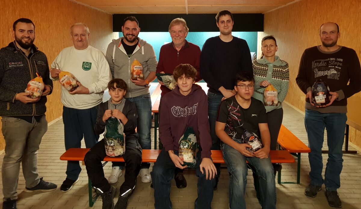 Sebastian König landete mit 67 Punkten auf dem ersten Platz und durfte sich über eine große 5-Kilo-Gans freuen. Walter Trauner und Oliver Schedl gewannen kleinere Weihnachtsgänse. Für die Plätze 4 bis 6 wurden Enten an Rudolf Kreuzer, Tobias König und Manuel Bauer verliehen. Gewinner von Hähnchen waren Mario Lenhardt, Peter Kulikow, Christina Kulikow sowie Patrick Uhl. Über den traditionellen Trostpreis, diesmal in Form einer aus Obst und Gemüse zusammengebauten „ganz veganen Gans“, durfte sich zwangsläufig Vereinsmitglied Peter Punzmann mit 19 Punkten freuen.