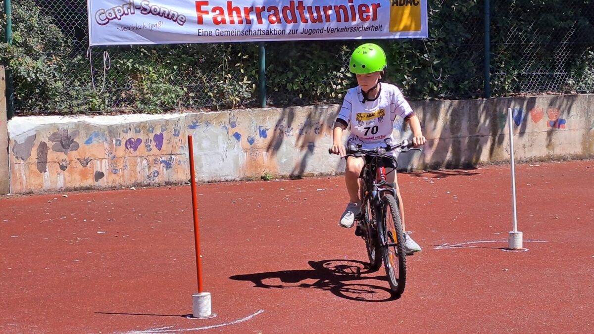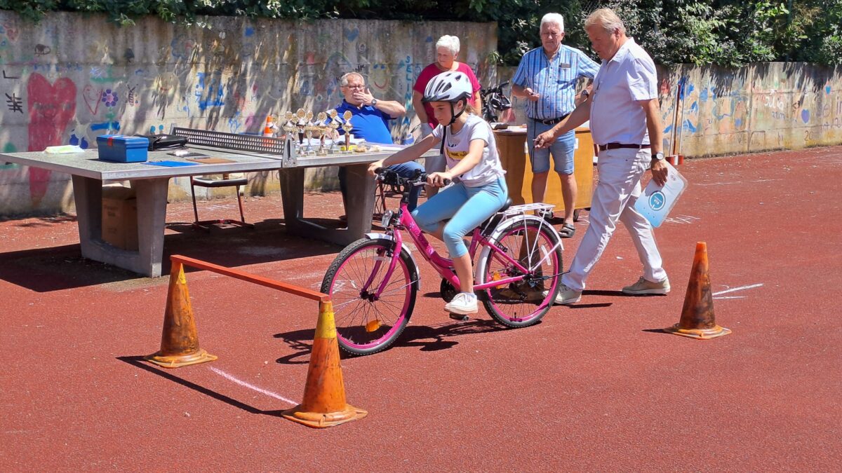 Zuerst mussten die von den Mädchen und Jungen, der zweiten bis vierten Klasse mitgebrachten, eigenen Fahrräder auf Verkehrssicherheit geprüft werden. Danach ging es auf den etwa 200 Meter langen, auf dem Allwetterplatz aufgebauten, Parcours mit acht Aufgaben. Hier konnten die Kinder spielerisch wichtige Fahrtechniken einüben, die sie im Straßenverkehr beherrschen müssen. Alle Teilnehmer fuhren natürlich mit Helm, denn „kluge Köpfe schützen sich“.