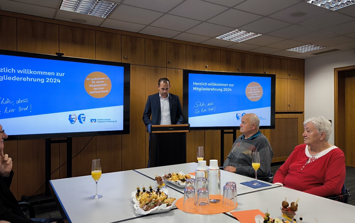 André Zitzmann hieß die Anwesenden herzlich willkommen, unter anderem den Vorstandsvorsitzenden der Raiffeisenbank, Frank-E. Kirchhof, das Vorstandsmitglied Michael Sommer sowie die Aufsichtsratsvorsitzende Eva Birkmüller. Gemeinsam wollten sie diesen besonderen Moment mit den langjährigen Mitgliedern feiern.