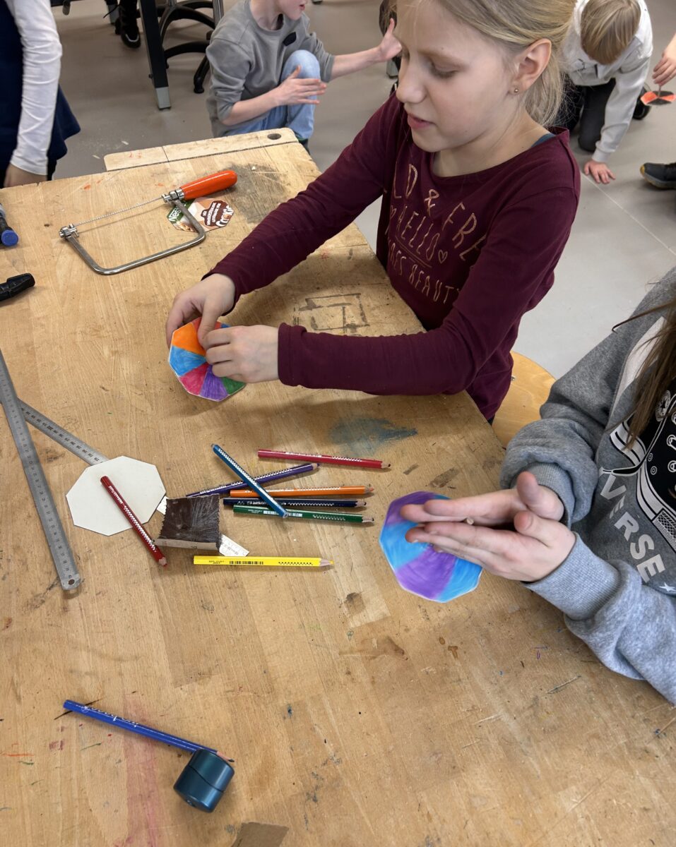 An der Werkstation war handwerkliches Geschick gefragt: Mit viel Begeisterung sägten die Kinder einen eigenen Kreisel aus Holz aus. Zum Abschluss bemalten sie ihre Kreisel bunt und durften sie als Erinnerung mit nach Hause nehmen.