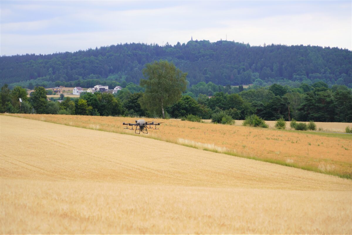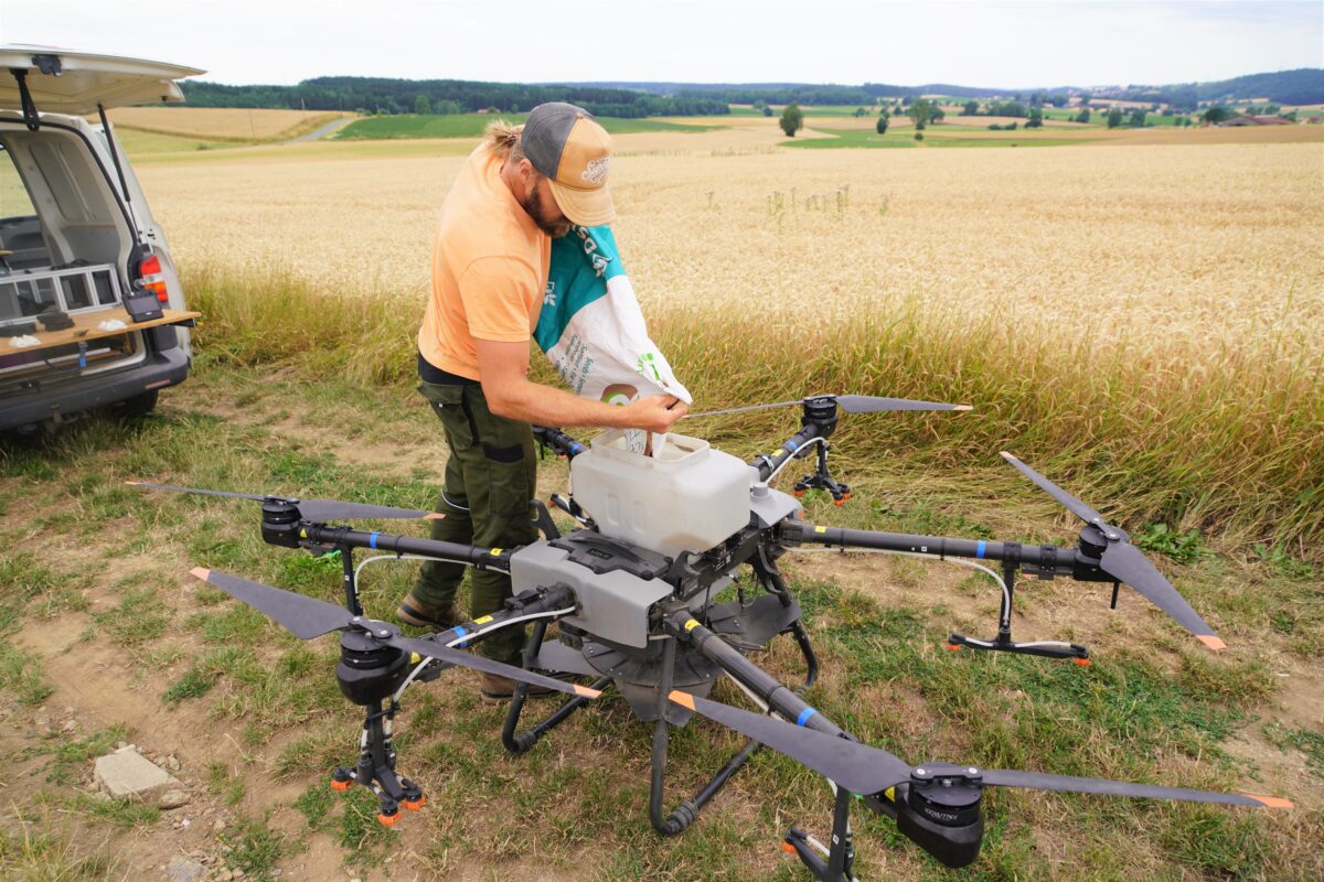 Dabei fallen Samenkörner zwischen den Halmen auf den Boden, keimen dort vor und es startet dabei schon den Vorgang, der eigentlich erst nach der Gerstenernte stattfindet und so habe man einen Zeit- und Wachstumsvorsprung. 20 Kilogramm von der Zwischenfrucht hat Wiesent sehr gewissenhaft in den Tank der Agrardrohne, die beim Flug eine Spannweite von mehr als drei Meter aufbringt, gefüllt.
