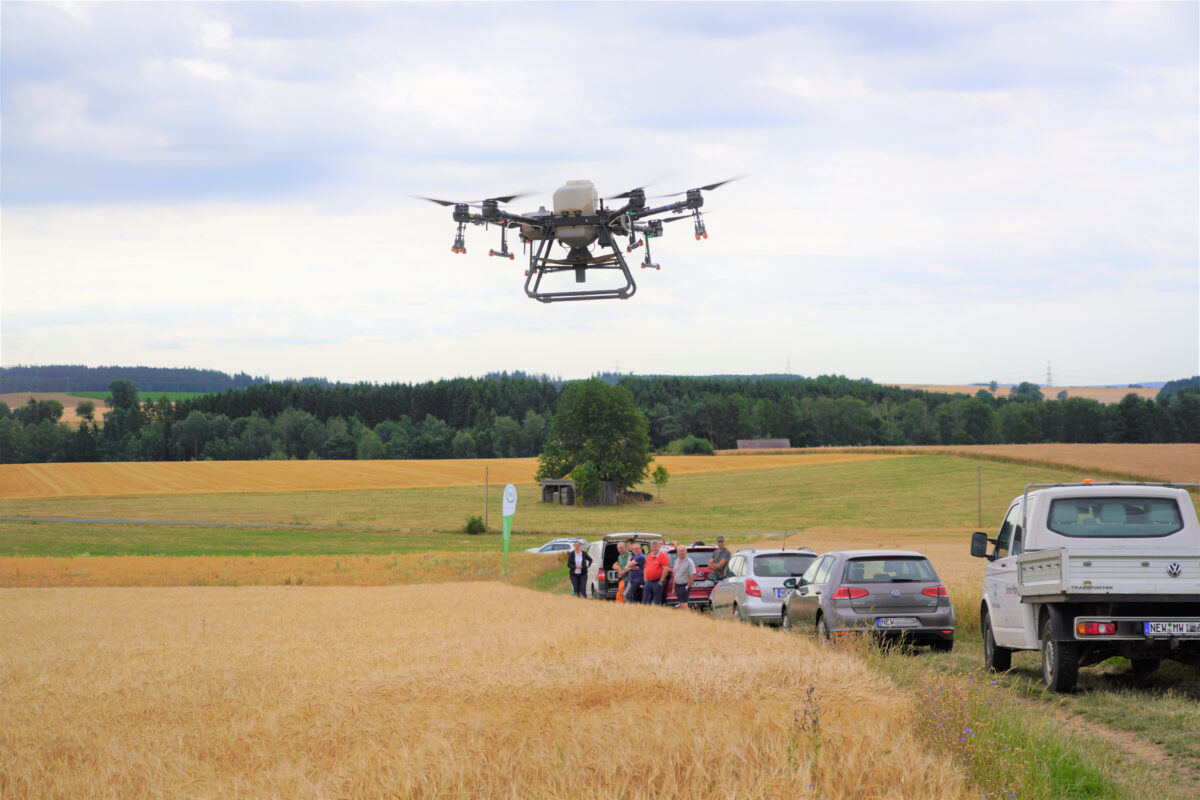 Im Mittelpunkt stand Drohnenpilot Michael Wiesent von der Firma DROWIES aus Luhe-Wildenau als Dienstleister für die Drohnentechnik. Nicht schlecht staunten alle Beteiligten, als Wiesent den Kofferraum seines Fahrzeugs öffnete, den Anwesenden Landwirt Bocka bat, das Gerät vorsichtig aus dem Fahrzeug zu heben.