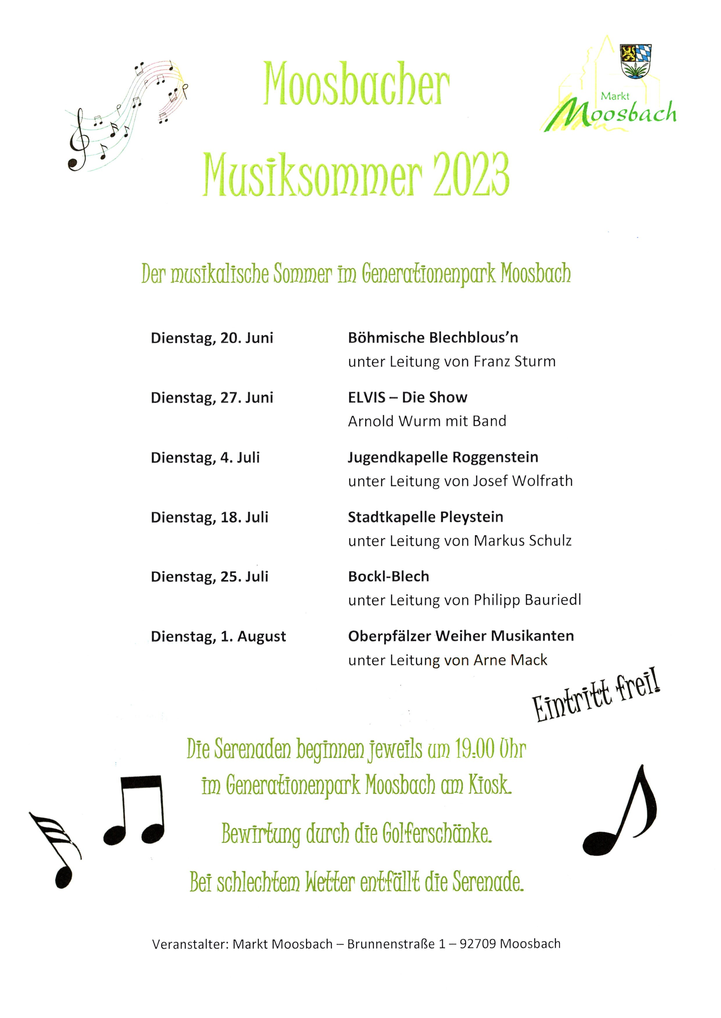 Die Reihe der Serenaden setzt am 4. Juli die Jugendkapelle Roggenstein mit Kapellmeister Josef Wolfrath fort. Die jungen Musiker bringen mit viel Spaß traditionelle Blasmusik bis hin zu modernen Stimmungsliedern zu Gehör. Am 18. Juli spielt die Stadtkapelle Pleystein unter der Regie von Markus Schulz zünftig mit böhmischer und bayerischer Blasmusik auf.