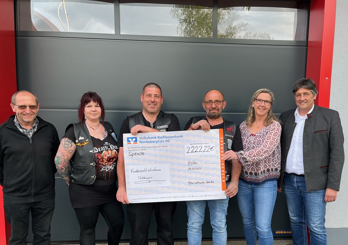 Die Spenden, die jedes Jahr beim Gottesdienst gesammelt werden, kamen in diesem Jahr dem Kinderpalliativteam Ostbayern in Amberg zu Gute. Da die Motorradfreunde in Steinfels in ihren eigenen Reihen leider einen Fall hatten, bei dem sie von diesem Team bestens unterstützt wurden, hatten sie sich entschieden, dem Team das Geld aus der Kollekte und dem Verkauf von Speisen und Getränke zukommen zu lassen. Und weil sie einen bestimmten Betrag erreichen wollten, legte der Verein noch etwas drauf, sodass am Ende 2.222,22 Euro übergeben werden konnten. So einen Betrag hatte es bei den 22 vorherigen Motorradgottesdiensten nicht gegeben.