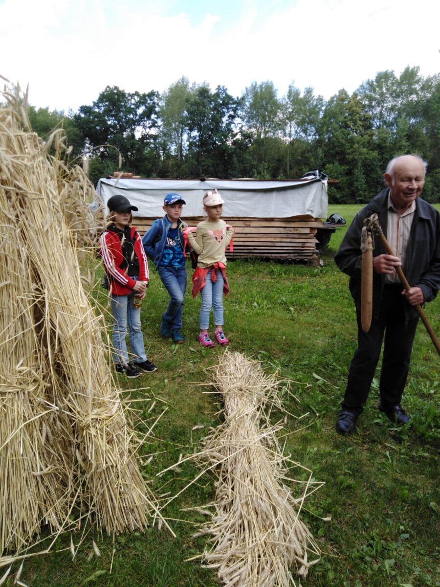 An der Blechmühle angekommen, konnten sich die Kinder stärken und etwas erholen. Hier erfuhren sie von Rosi Schuller Wissenswertes über den Betrieb dieser Mühle. Ein „Kornmandl“ war aufgebaut und sie erhielten einen kleinen Einblick, wie früher mit einem Dreschflegel umgegangen wurde.