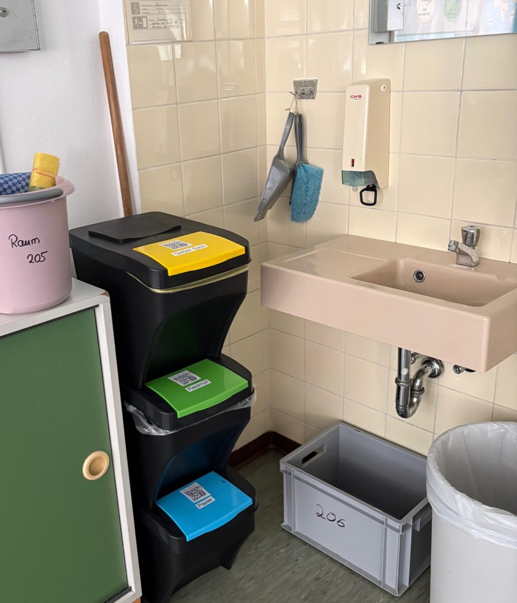 Ab sofort stehen in jedem Klassenzimmer drei Müllbehälter bereit – für Papier, den Gelben Sack und Restmüll. Zusätzlich gibt es eine Putzstation mit einem Putzeimer und Lappen. Diese trägt zur Sauberkeit der Klassenzimmer bei. Die Klassen sind selbst dafür verantwortlich, ihre Müll- und Putzstationen sauber und ordentlich zu halten. Ist ein Behälter voll, müssen die Schülerinnen und Schüler diesen eigenständig leeren und einen neuen Müllsack einsetzen. Die Putzlappen sind wiederverwandbar.