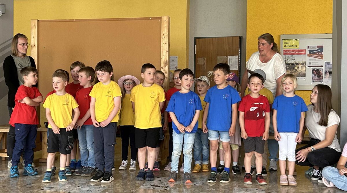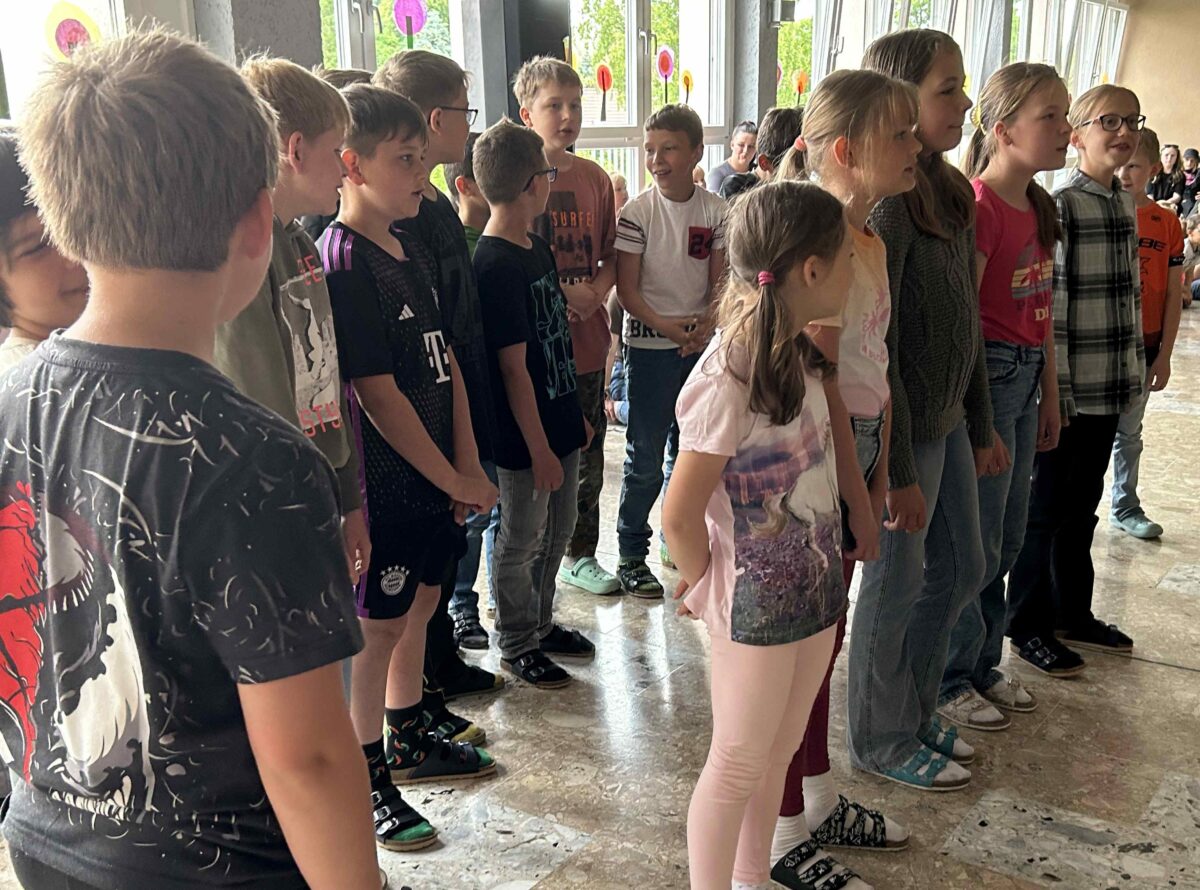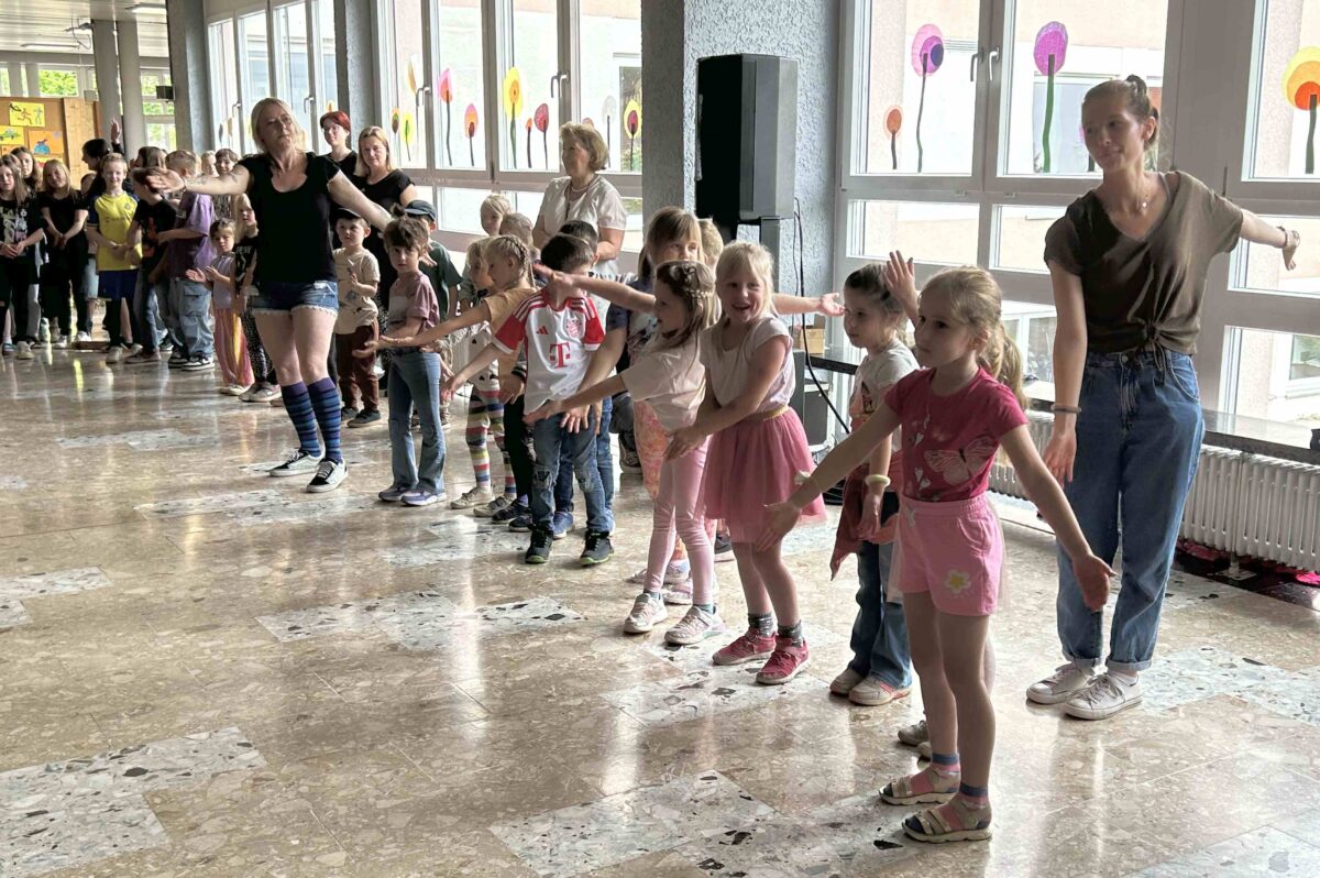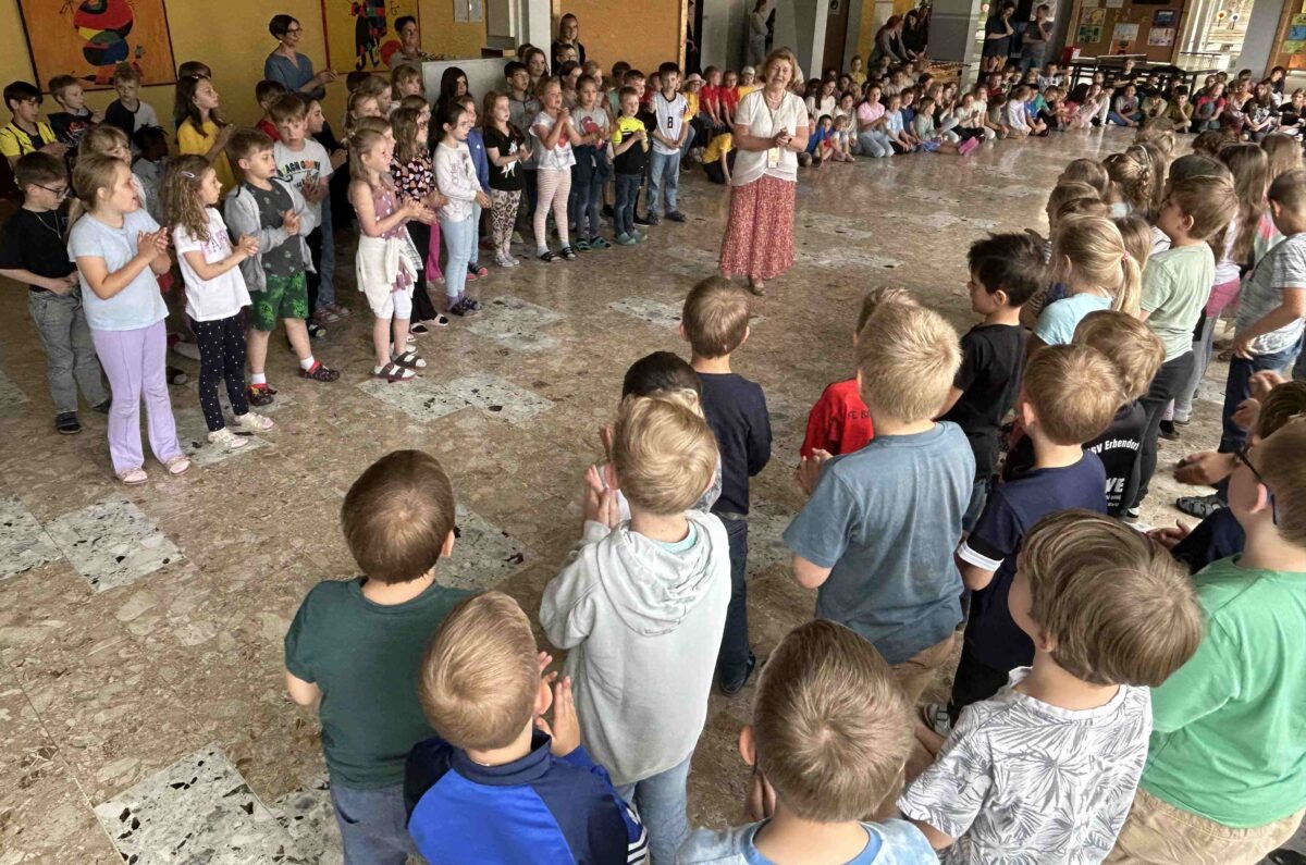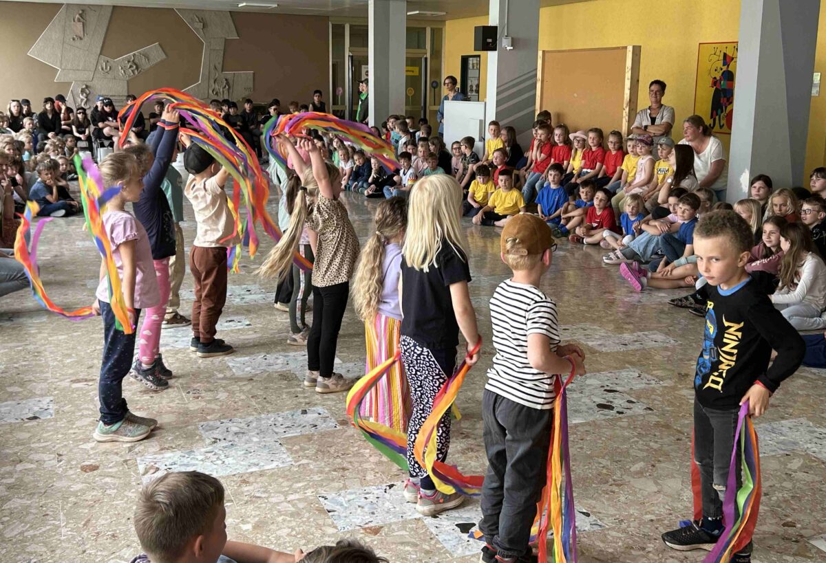 Zu der Melodie „Ein Männlein steht im Walde“ sangen die kommenden Erstklässler des katholischen Kindergartens „St. Elisabeth“ ein amüsantes Lied über die Schule und zauberten vielen Schülerinnen und Schülern dabei ein Lächeln ins Gesicht. Begeistert machten alle Anwesenden mit, als die Kinder der städtischen Kindertagesstätte „Kunterbunt“ zum gemeinsamen Tanz zu flotter Popmusik aufforderten. Ein Lied über die Besonderheiten der vier Jahreszeiten gestalteten anschließend die vier FleGS-Klassen: „Ich lieb den Frühling“.