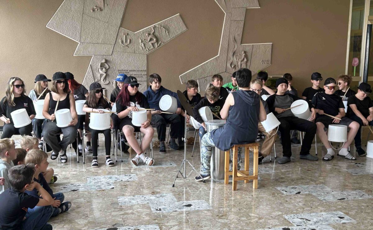 Auch dieses Jahr trafen sich alle Klassen der Grundschule Erbendorf, um in der Aula gemeinsam Musik zu machen. Diesmal waren auch die Vorschulkinder der drei Erbendorfer Kindergärten sowie die 5. Klasse der Mittelschule mit dabei. Die Fünftklässler der Percussionklasse eröffneten die musikalische Veranstaltung mit einem Rondo, das sie auf Plastikeimern rhythmisch perfekt und variantenreich zu Gehör brachten. Danach entzückten die Vorschulkinder des evangelischen Kindergartens „Regenbogen“ mit einem Tanz, den sie mit bunten Bändern an den Handgelenken gestalteten.