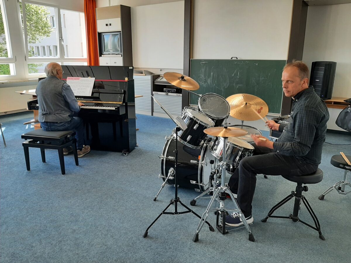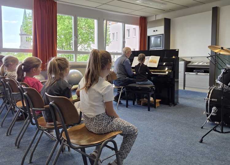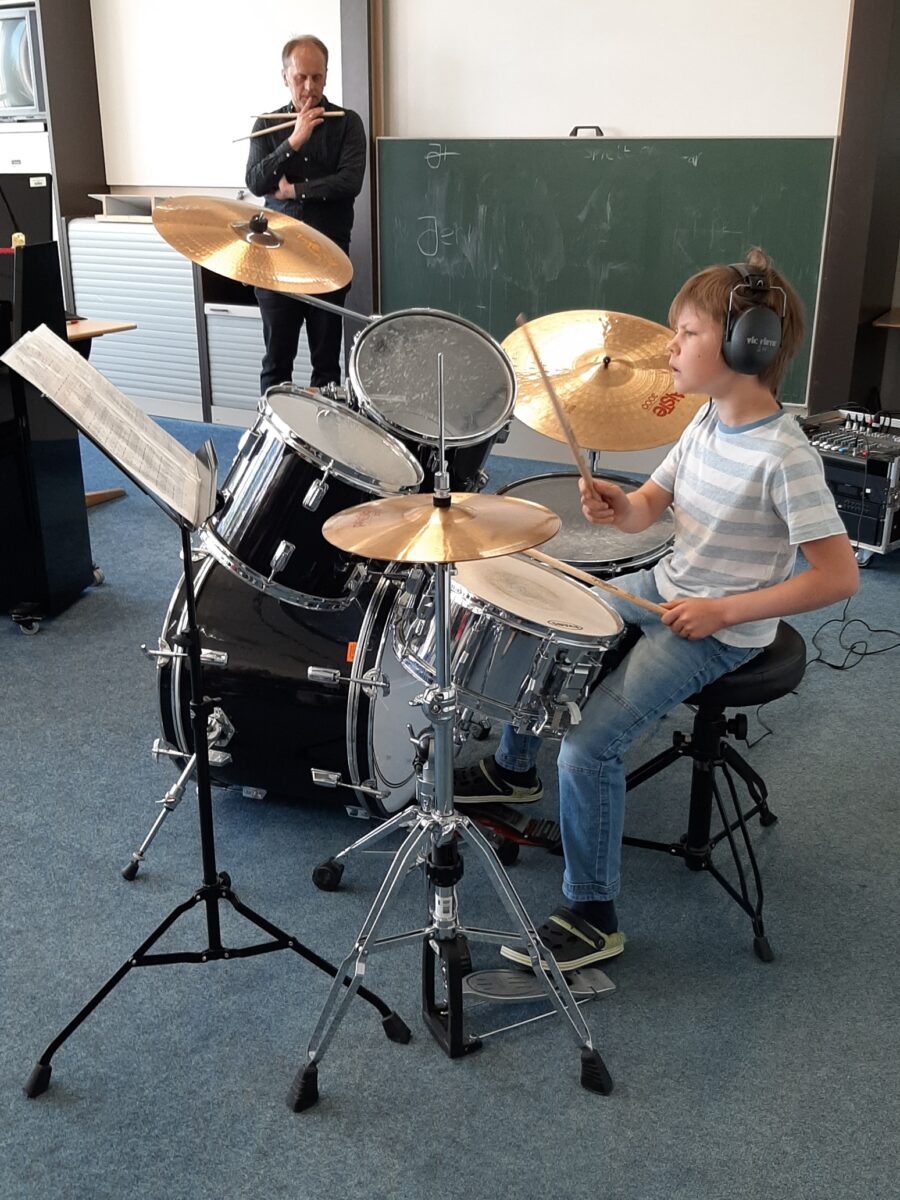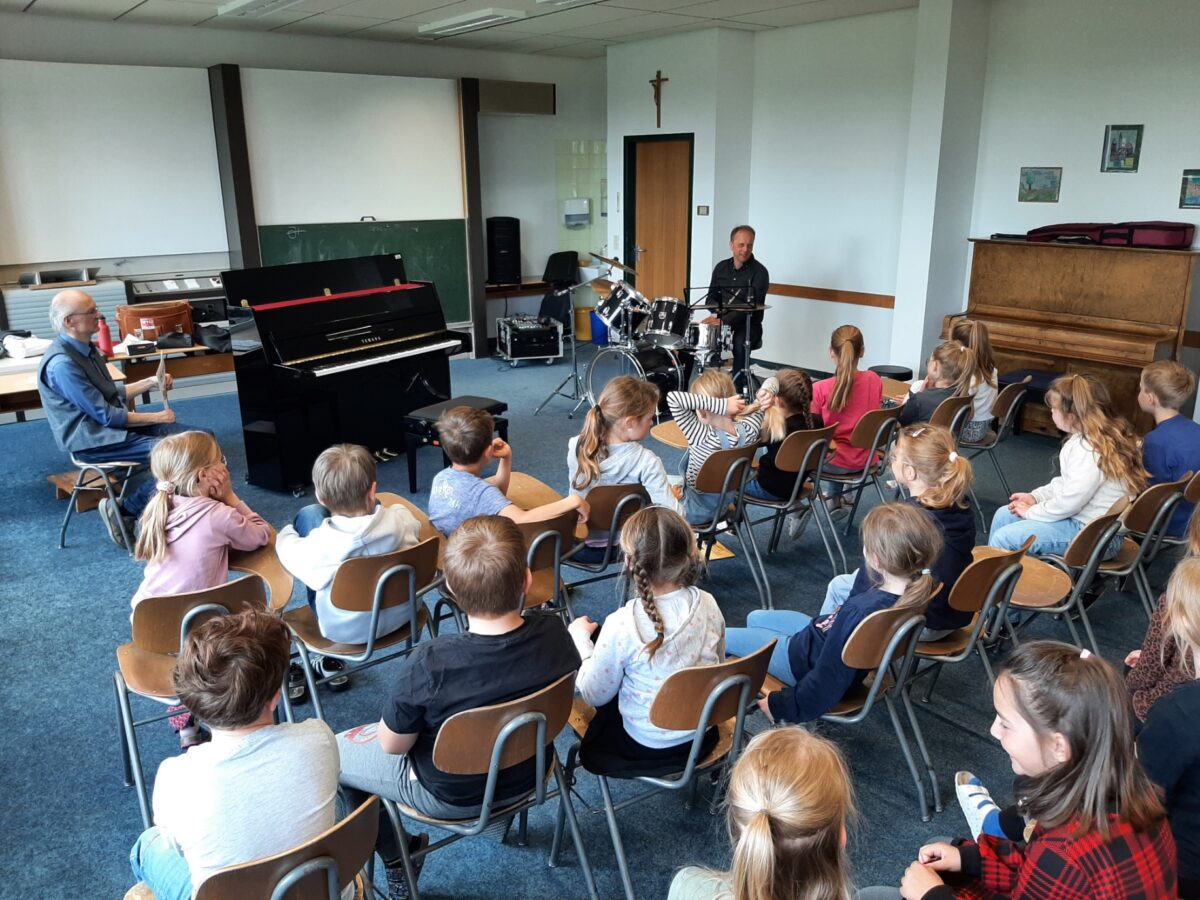 Edda Schraml aus der 1/2a spielte gekonnt „Hänsel und Gretel“ und dann mit ihrem Klavierlehrer Helmut Burkhardt vierhändig „When the saints go marching in“ auf dem Piano. Max Schmidkonz erklärte den Schülerinnen und Schülern den Aufbau des Schlagzeugs mit den großen und kleinen Trommeln sowie des Beckens. Er begleitete Burkhardt beim Klavierspiel, präsentierte aber auch selbst verschiedene Rhythmen, darunter das allseits bekannte „We will rock you“, das die Kinder sogleich mitklatschten. Gerne studierten sie mit den Lehrern eine einfache Bodypercussion ein, die sie als Begleitung zu „Hey, Pippi Langstrumpf“ ausprobierten.