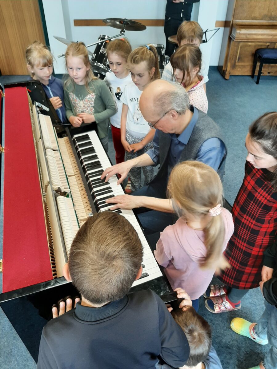 “Klavier trifft Schlagzeug” – unter diesem Thema war die Kreismusikschule heuer zu Gast bei den ersten bis dritten Klassen der Grundschule Erbendorf. Das Klavier wurde von Helmut Burkhardt vorgestellt. Er brachte die Titelmelodie von der „Sendung mit der Maus“, den „Türkischen Marsch“ von Mozart und „Für Elise“ von Beethoven zu Gehör. Danach zeigte er den Kindern die Funktionsweise des Klaviers, indem er die Vorderwand des Instruments entfernte. Auf diese Weise konnte man die Saiten sehen, die beim Spielen von Hämmerchen angeschlagen werden.
