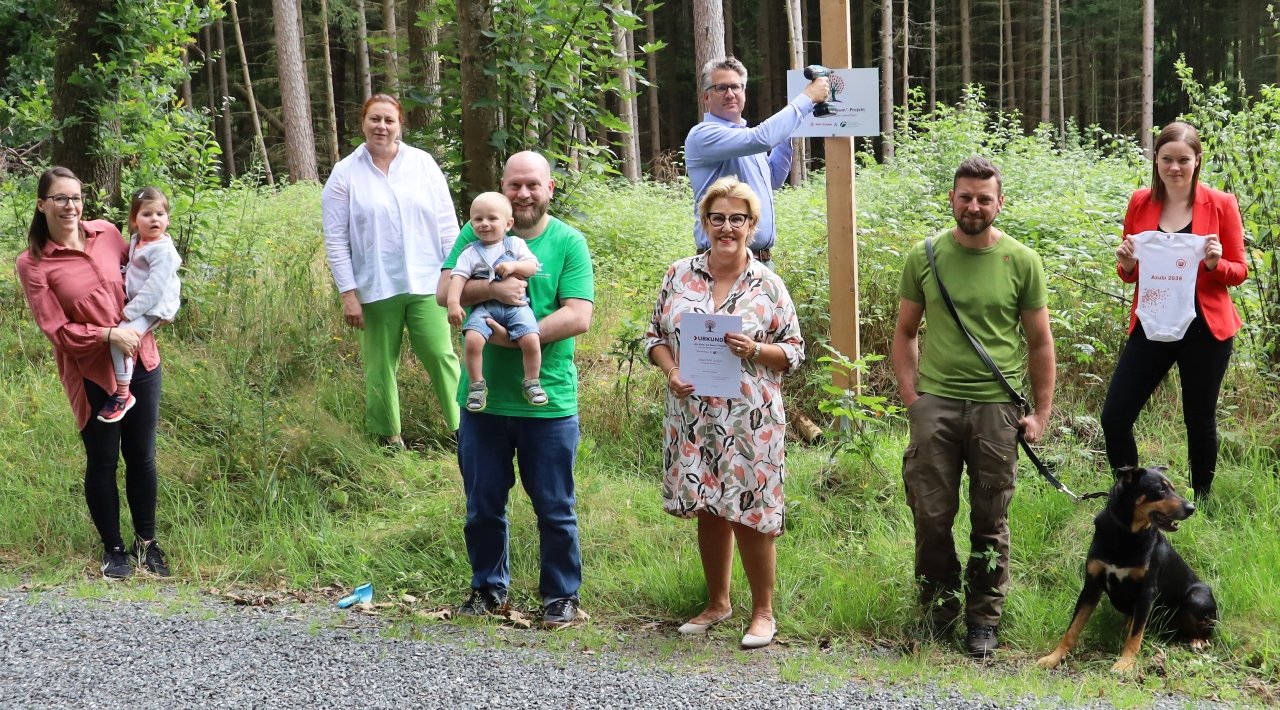 In diesem Jahr entstand nach einer Baumgruppe aus Douglasien bereits der zweite Hain mit Esskastanien. Um die neue Baumgruppe zu kennzeichnen haben sich Stefanie Zühlke-Schmidt (Geschäftsführerin Einkauf), Philipp Bahnmüller, Betriebsleiter Bayerische Staatsforsten, und Revierförster Robert Werner sowie weitere Projektverantwortliche aus der Witt-Gruppe in der Nähe der Gemeinde Mantel getroffen.