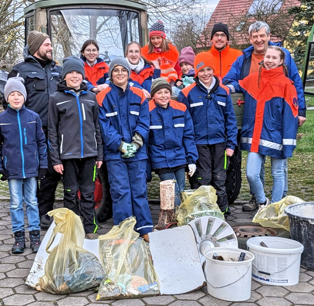 Die Kommandanten Müller und Gmelch stellten je einen Traktor zur Verfügung. Auf diese Weise konnte der Müll gleich aufgeladen werden. Die Mädchen und Jungen wurden bald fündig und sammelten fleißig Plastikbecher, allerlei Glasflaschen und Folien auf. Auch Plastikplanen, Kopfhörer, Rauchmelder, Lichterketten und ein Reifen mit Felge mussten beseitigt werden.