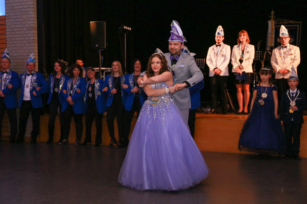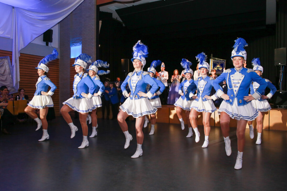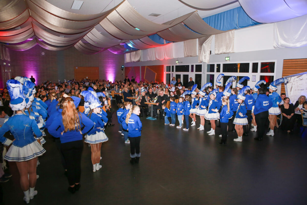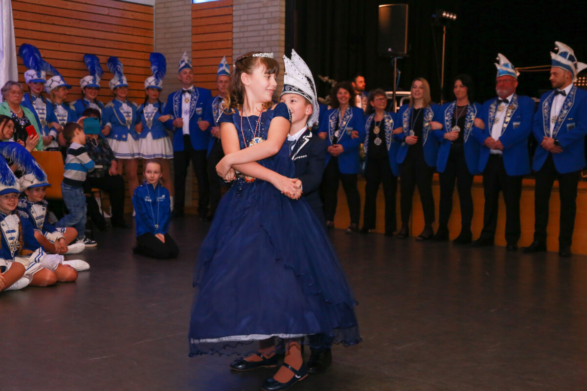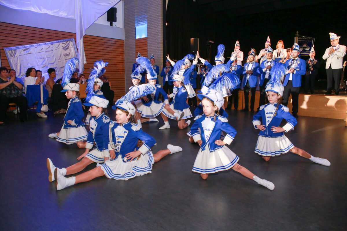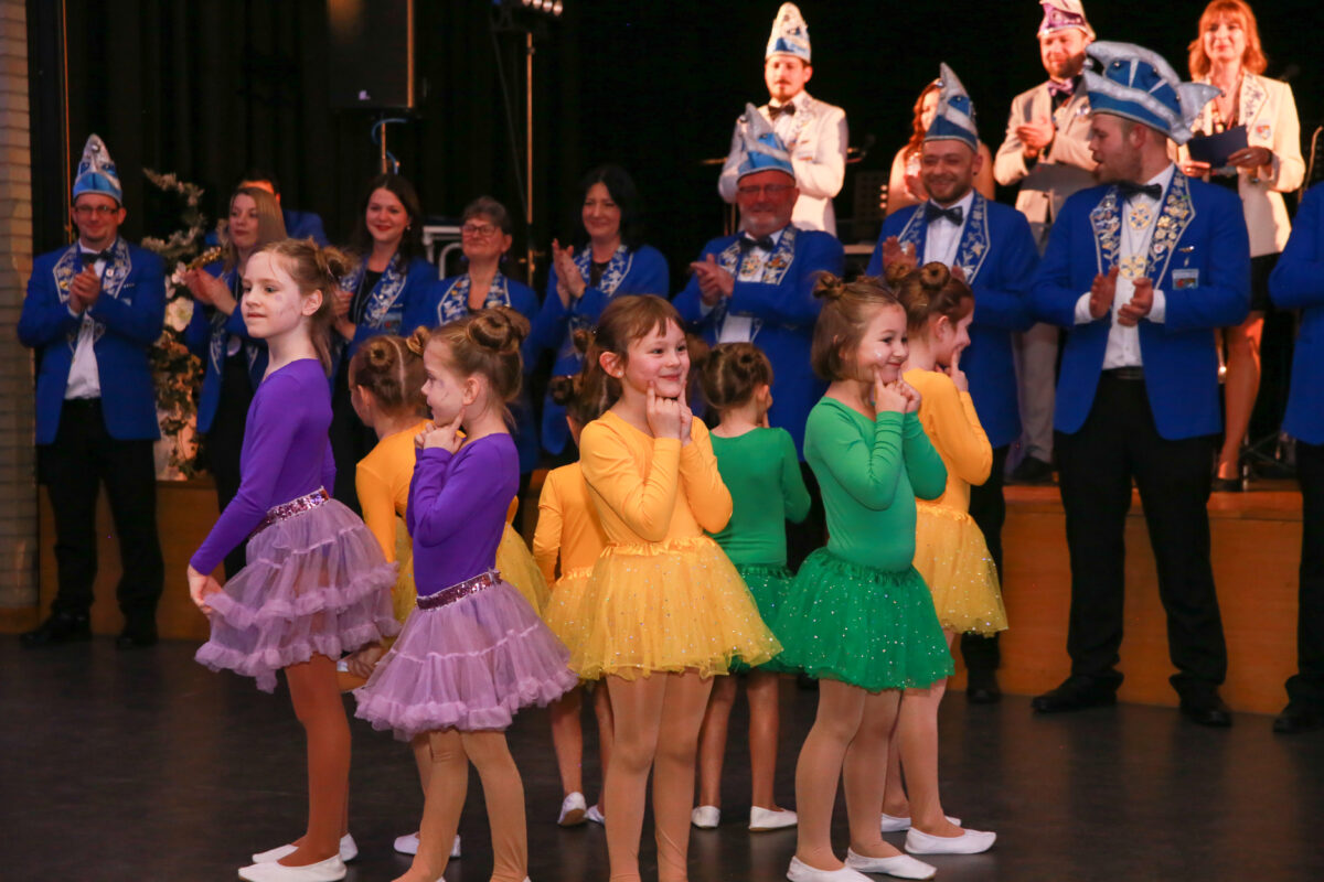 Nach dem feierlichen Auftakt präsentierten die Prinzenpaare ihren Prinzenwalzer, bevor die Band “Royal” die musikalische Unterhaltung des Abends übernahm. Ein Highlight jagte das nächste: Die Bambinigarde eröffnete mit ihrem Motto „Gummibärchenbande“ die tänzerischen Darbietungen und zauberte den Gästen ein Lächeln ins Gesicht. Es folgten die perfekt einstudierten Gardemärsche der Kindergarde sowie der beiden Funkenmariechen Lara und Pauline, die als kleine Hexen mit Besen einmarschierten und das Publikum begeisterten.