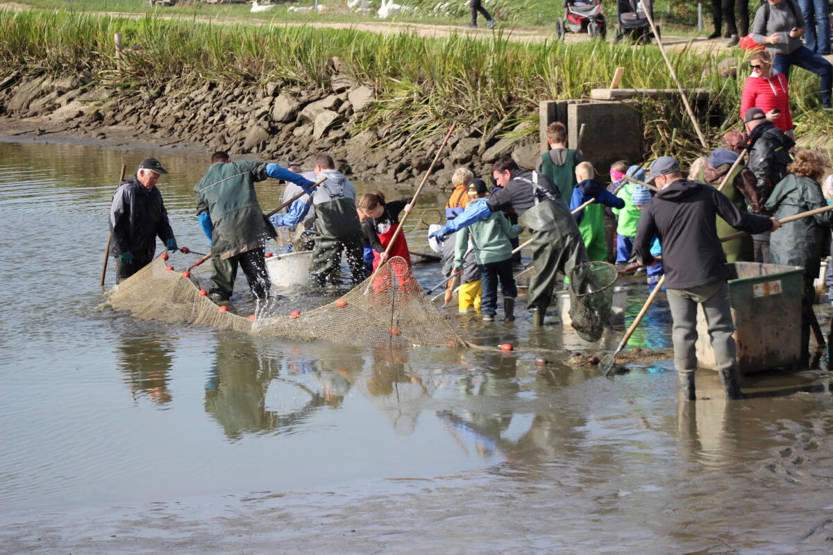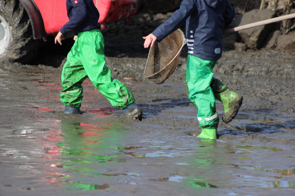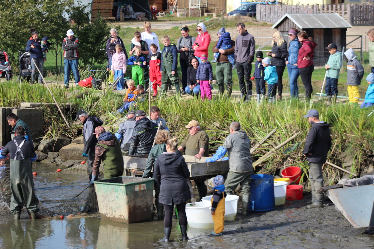 Dass das Arbeiten in und mit der Natur eigenen Gesetzen folgt, erfuhren die Kinder dabei gleich zu Beginn. Sie mussten noch etwas warten, weil das Wasser im Teich noch nicht weit genug abgelaufen war. Langeweile kam deswegen trotzdem keine auf – denn schließlich gab es schon viel zu beobachten, während die erwachsenen Helfer die ersten Netze spannten und alles fürs gemeinsame Abfischen vorbereiteten.