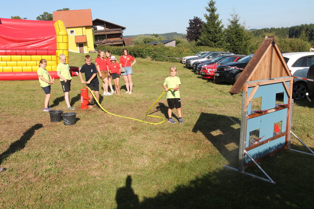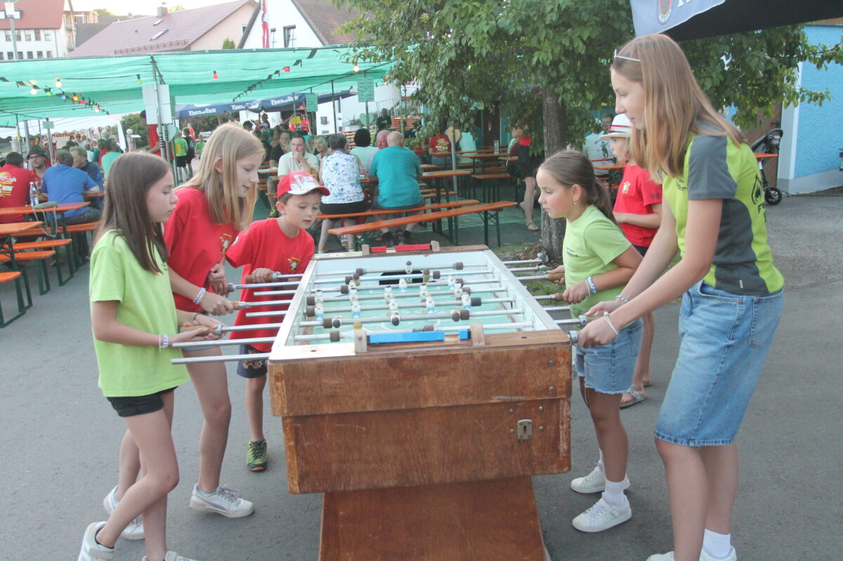 Auch die Kinder kamen wie immer voll auf ihre Kosten. So war es für die Jüngsten unter ihnen eine Riesengaudi, ihre Zielsicherheit an der Kübelspritze unter Beweis zu stellen oder in der Hüpfburg zu toben. Dabei waren auch die “Feuerfüchse” der Kinderfeuerwehr in ihrem Elan. Spannende Matches wiederum lieferten sich die jungen Leute am Kicker. Gefragt waren auch die Festkalender 2026 anlässlich des 140-Gründungsjubiläums, das die Feuerwehr vom 29. bis 31. Mai 2026 feiern kann. Da drehten die Festdamen und -burschen um Festbraut Magdalena Woppmann ihre Runden und priesen das Werk an.