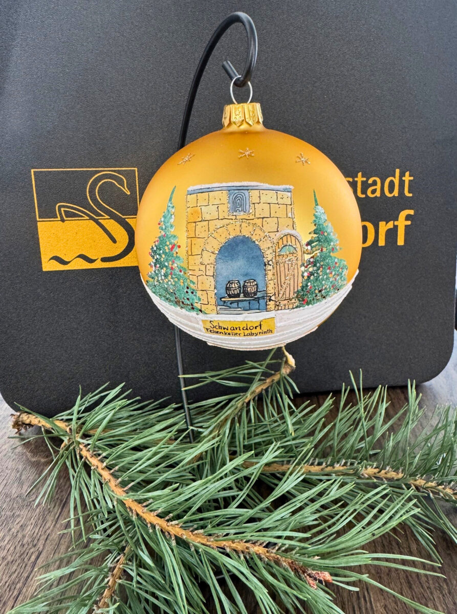 In Schwandorf ist ab sofort die neue Christbaumkugel im Tourismusbüro erhältlich. Sie zeigt das Felsenkeller-Labyrinth und setzt die städtische Serie weihnachtlicher Sammlerartikel fort. Die goldene Kugel rückt ein weiteres Wahrzeichen der Stadt in den Mittelpunkt. Nach den Editionen 2023 mit dem Marktplatz und 2024 mit dem Blasturm folgt nun die Ausgabe 2025 mit dem Felsenkeller-Labyrinth.