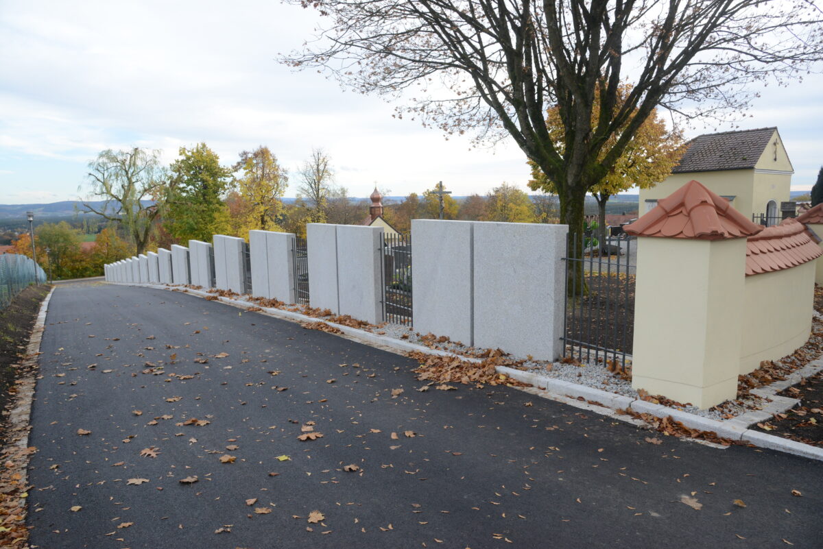 Münchmeier & Eigner beauftragt. Die Gesamtlänge der neuen Friedhofsmauer mit Granit- und Zaunelementen an der Nord- und Südseite umfasst rund 100 Meter. An der Westseite wurde die bestehende Mauer auf eine Länge von zehn Metern mit verputztem Mauerwerk und Ziegelabdeckung ergänzt. Insgesamt wurden dafür 56 Granitelemente in Fertigteilfundamenten versetzt. Jedes Granitelement hat ein Gewicht von rund