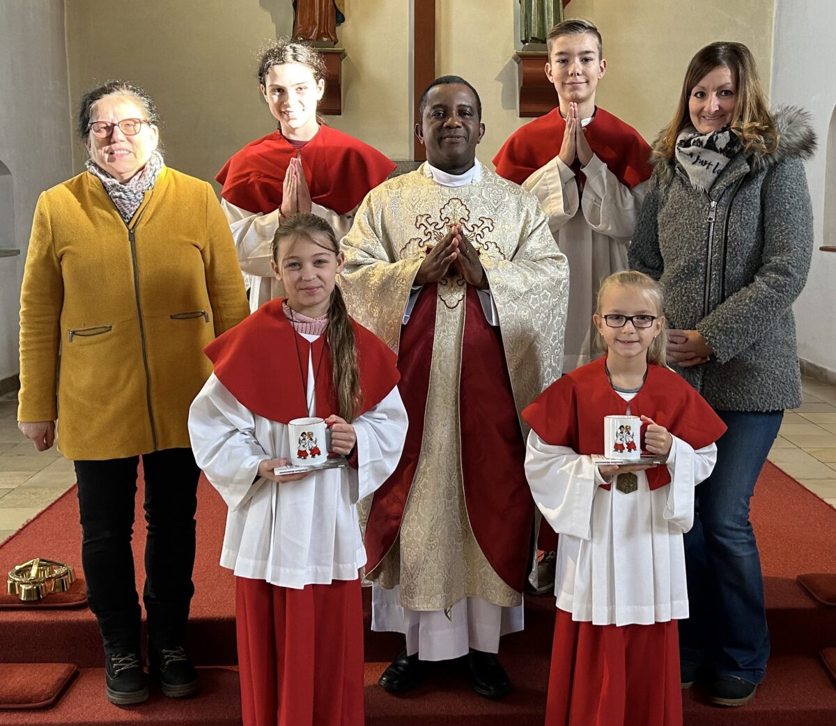 Nach der Predigt rief diese die beiden neuen Ministrantinnen Romina Wolf und Lisa Bock in den Altarraum, wobei die mutigen Jugendlichen dabei mit viel Applaus von den Kirchenbesuchern bedacht wurden. Der Pfarrvikar segnete die Ministranten-Kreuze, die anschließend von den beiden Ministranten Paula Stahl und Felix Bock ihren neuen Kolleginnen umgehängt wurden. Auch eine eigene Ministranten-Tasse, sowie ein kleines Mini-Lexikon überreichte der Pfarrvikar an Romina Wolf und Lisa Bock.