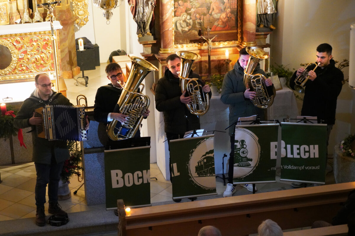 Musikalisch inspirierend umrahmt wurde die Lesung vom Waldthurner Frauendreigesang „TriAngel“ mit Andrea Götz (Sopran), Steffi Daubenmerkl (Mezzosopran) und Doris Völkl (Alt). Mit ihrem klaren, harmonischen Stimmen prägten und ergänzten sie die außergewöhnliche, adventliche Stimmung. Lieder wie „Im Dunkel naht die Weihnacht“, „Die stillste Zeit“, „Nun es nahen sich die Stunden“ und „Maria durch ein Dornwald ging“ schufen im Kerzenschein einen feierlichen Rahmen mit besonderer Atmosphäre. Festliche, musikalische Akzente setzte zudem die Bläsergruppe „Bocklblech“ aus Waidhaus mit Tobias Fürtsch (Tuba), Ludwig Greß (Tenorhorn), Jonas Schmid (Tenorhorn), Thomas Bayer (Trompete) und Philipp Bauriedl (Steirische Harmonika und Posaune). Die fünf jungen Männer aus dem Grenzland erfüllten die Kirche mit ihren kräftigen, aber warmen Bläserklängen und der „Quetschn“ von Philipp Bauriedl. Mit Stücken wie „Sol Invictus“, „Advent ist ein Leuchten“ und „Trag mi Wind“ war böhmisches Flair zu hören. Bauriedl begleitete außerdem „TriAngel“ auf der Steirischen Harmonika. Ein besonderer Höhepunkt war das kraftvoll interpretierte „The Power of Love“ (Original von Jennifer Rush, 1984), mit dem die Bläsergruppe die Zuhörer noch einmal intensiv berührte.