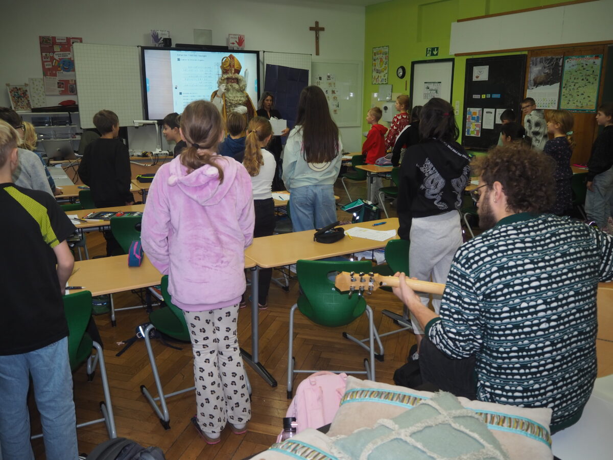 Viele Klassen sangen das Lied „Lasst uns froh und munter sein“, von den Lehrerinnen auf der Gitarre begleitet oder ohne Begleitung. Es war das Lieblingslied des Heiligen Nikolaus. Ein Mädchen trug ein lustiges Nikolausgedicht vor. Eine Klasse las Nikolausreime in abwechselnden Gruppen im Chor. „In der Weihnachtsbäckerei“ konnte der Nikolaus in Liedform hören, welche lustigen Dinge sich dort beim Plätzchenbacken ereignen. „Feliz Navidad“, für das sich eine der beiden vierten Klassen entschied, sei eines der Lieder, das er nicht so oft höre, wusste der Heilige zu berichten.