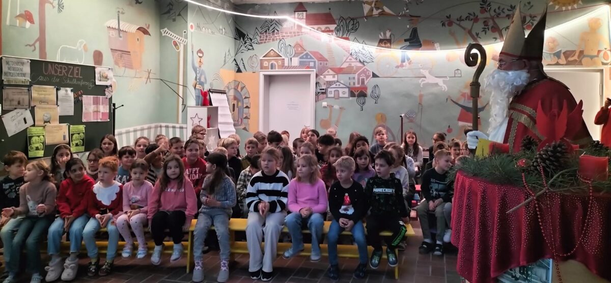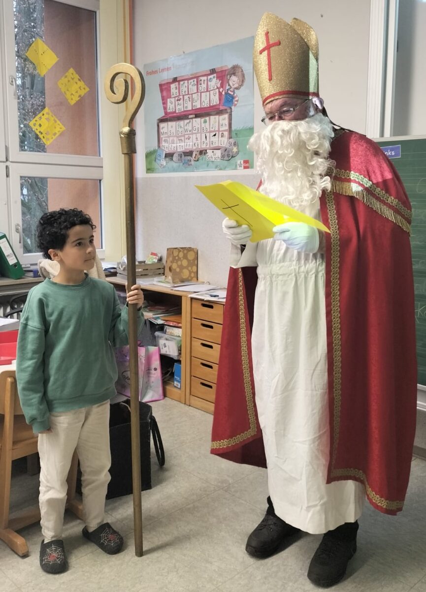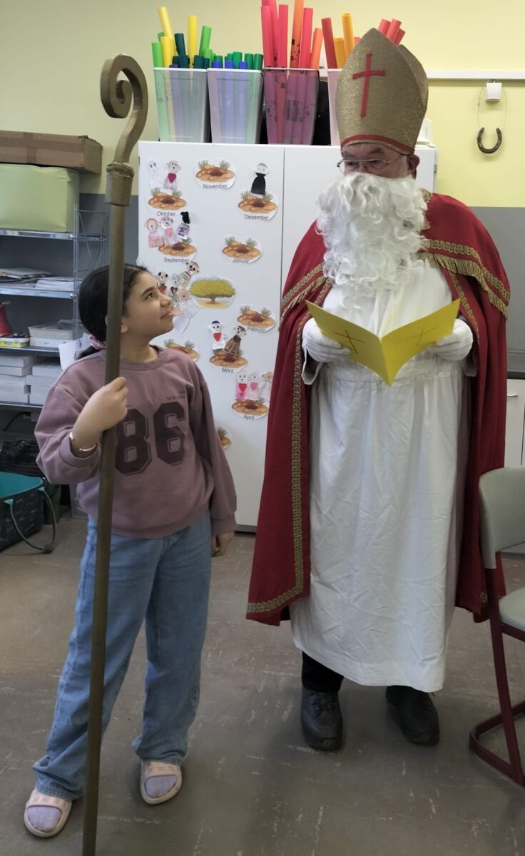 Im Anschluss an die Feier in der Aula besuchte der Nikolaus die einzelnen Klassen, lobte und tadelte und hatte für jedes Kind ein Geschenk dabei.
