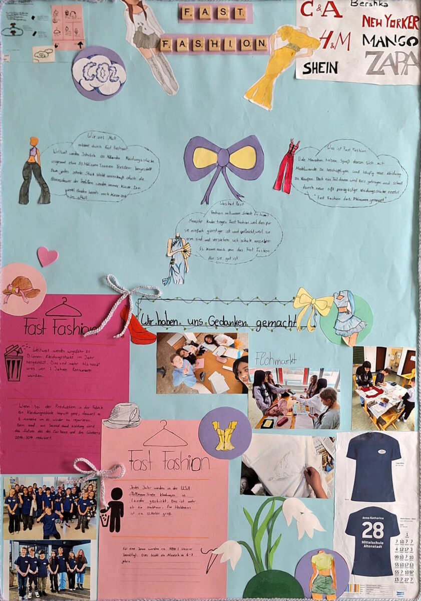 Im Rahmen des Wettbewerbs „Partnerschule Verbraucherbildung“ von Verbraucher- und Kultusministerium haben die Schülerinnen und Schüler der fünften Klasse ein eindrucksvolles Plakat zum Thema Fast Fashion gestaltet. Mit viel Kreativität und Engagement haben sie die Problematik der schnellen Modeproduktion und deren Auswirkungen auf Umwelt und Gesellschaft veranschaulicht.