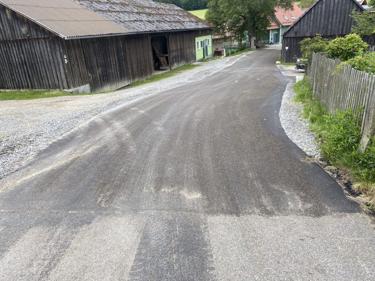 Färberbäckergasse Die arg ramponierte Straße ist schon seit langem ein Dauerthema wenn es um Sanierungsmaßnahmen ging. Nachdem ein kompletter Ausbau im Haushalt nicht unterzubringen ist und Maßnahmen zur Dorferneuerung nicht abzusehen sind, war das Aufbringen einer Oberschicht mit einer entsprechenden Querneigung zum kontrollierten Ablauf des Oberflächenwassers die wirtschaftlichste Lösung. Die Kosten für die bisher durch Firma Huber, Rötz, instand gesetzte Fläche betragen rund 11.000 Euro. In gleicher Weise soll auch die Restfläche instand gesetzt werden.