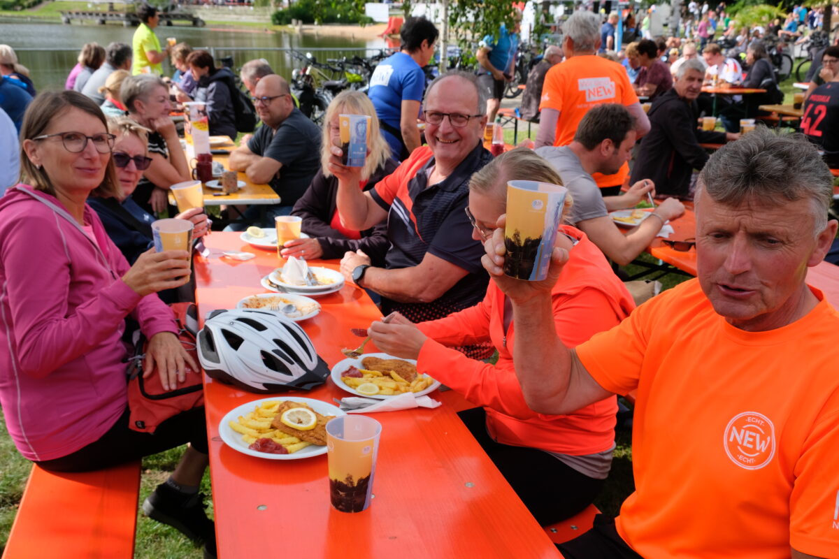 Den krönenden Abschluss des Festivals bildet die Ankunft der 250 Teilnehmer der NEW-Radltour, angeführt von Vizelandrat Albert Nickel, die nach ihrer 60 Kilometer langen Rundfahrt auf dem Festivalgelände gemeinsam entspannen. Die Pedal-Ritter genießen die Atmosphäre des Seebades, während sie sich mit Radler, den Köstlichkeiten des BRK-Wasserwacht-Teams und der Live-Musik der Mystery6-Band erholen.