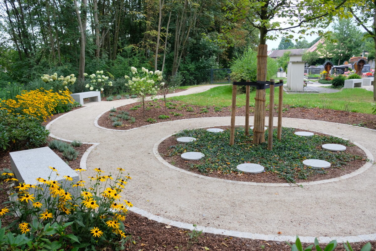 Die Gestaltung des Urnenfeldes mit 32 Urnenplätzen, die von Granit-Namenstafeln abgedeckt werden, und die Integration einer Baumbestattung unter einer stattlichen Buche, umgeben von weiteren acht Röhren für Urnen, macht diesen Ort zu einem besonderen Platz des Gedenkens. Zu diesem harmonischen Gesamtbild tragen auch vier massive Granit-Sitzbänke, die bereits vorhandenen Urnenstelen und ein kleiner Park mit geschwungenen Wegen, Blumenbeeten und blühenden Sträuchern bei.