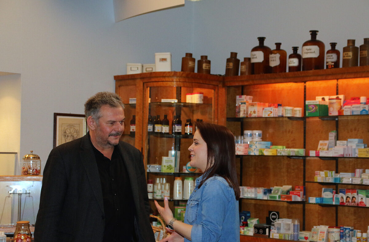 Was man hier in zehn Jahren erlebe, sei schon sehr emotional. Im nächsten Raum, der Apotheke, ist alles penibel nach Bamberger Art eingeräumt. Nur Horst Kummeth, die Verkörperung Roland Bambergers fränkischer Gscheithaflerei fehlt hinterm Tresen. „Hier ist der Bambi dahoam“, präsentiert Carina die pharmazeutische Abteilung Lansings, „hier stellt er uns immer die Rezepterl aus, wenn wir mal was haben.“