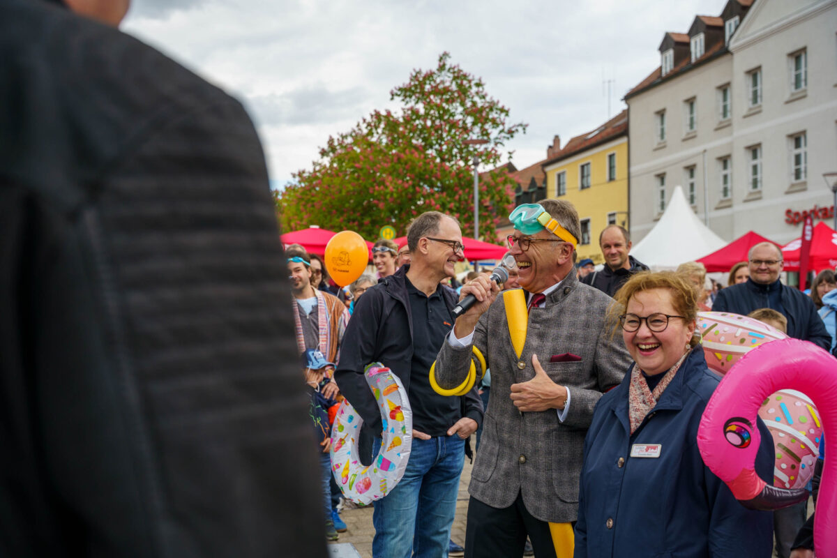 Einen besonderen Höhepunkt stellte die Stadtwette dar. Unter dem Motto „Wiegt Tirschenreuth die Walze auf?“ trat die Stadtgemeinschaft gegen eine tonnenschwere Walze der Firma HAMM an. Dank des Einsatzes vieler Bürgerinnen und Bürger, die mit originellen Schwimmutensilien, ob Schnorchel, Flossen oder aufblasbaren Flamingos, erschienen, konnte der Geldpreis für den sozialen Zweck gewonnen werden. Der Betrag von 2.500 Euro kommt LEBENplus Tirschenreuth zugute, einer Einrichtung, die ältere Menschen im Alltag unterstützt.