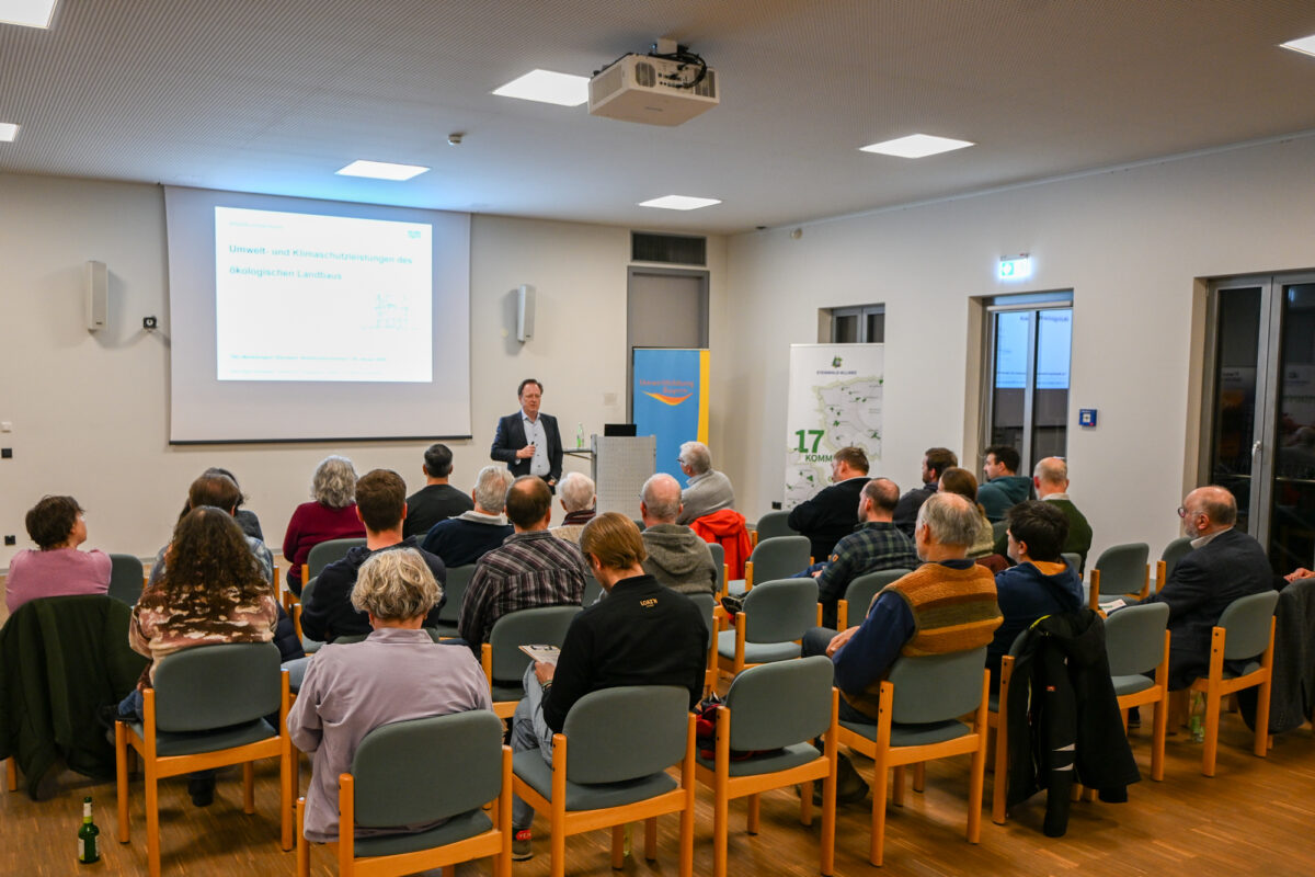 Mit vielen praxisnahen Beispielen machte der Referent die komplexen Zusammenhänge verständlich und verdeutlichte, welches Potenzial der Ökolandbau für den Klima- und Umweltschutz bietet. Auch die volkswirtschaftlichen Vorteile durch vermiedene Umwelt- und Folgekosten wurden anschaulich dargestellt. Im Anschluss an den Vortrag nutzten die Teilnehmenden die Gelegenheit zu einer lebhaften Diskussion und stellten zahlreiche Fragen zu regionalen und betrieblichen Umsetzungsmöglichkeiten. Das große Interesse zeigte, dass das Thema nachhaltige Landwirtschaft und Klimaschutz in der Region auf breite Resonanz stößt.