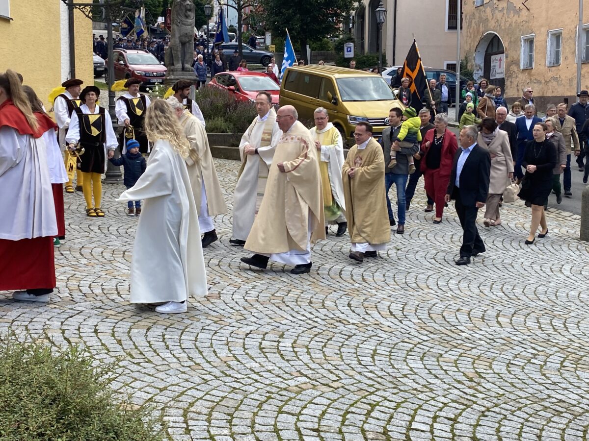 Angeführt von der Fanfarengruppe der Kolpingfamilie Tännesberg bewegte sich der Festzug mit der Geistlichkeit und den Fahnenabordungen der Vereine und Verbände und politischer Prominenz vom ehemaligen Forstamt zur voll besetzten Pfarrkirche „St. Michael“. Den Einmarsch begleitete musikalisch die Blaskapelle Gleiritsch unter der Leitung von Paul Braun.