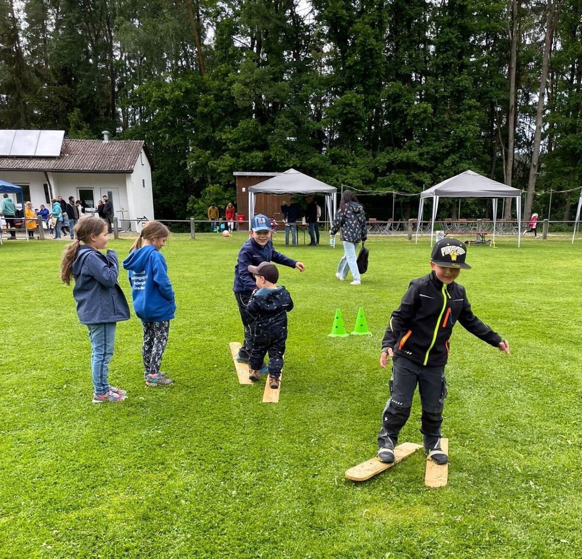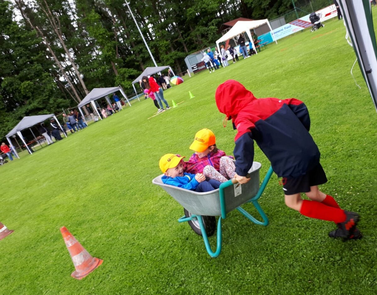 Im Anschluss bewiesen die Kinder an verschiedenen Stationen stolz ihr Können. Ob beim Grasskifahren, Schubkarrenwettrennen, oder einer Gummibärchenschleuder – so manches Mal mussten auch Mama oder Papa mit ran. Dank Unterstützung der Eltern und des Elternbeirats wartete ein buntes und reichhaltiges Buffet auf die hungrigen Kinder.