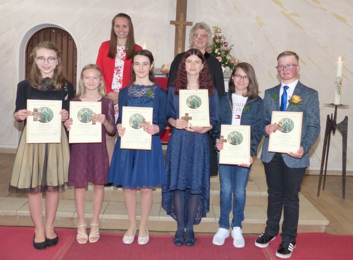 Joana Hösl durfte die Lesung vortragen. Stephan Schütz vom Kirchenvorstand, freute sich über die nun vollwertigen Gemeindemitglieder und lud die jungen Christen zur Mitarbeit ein. “Das Christentum hat sich mit seinen Werten über Jahrhunderte bewährt. Ich fordere Euch auf”, so Schütz, “beim Bodenpersonal aktiv mitzuarbeiten”. Jasmin John, Jamie Leitner, Anastasia und Samantha Nitz und Lilly Ott wiederholten vor den gesamten Gottesdienstbesuchern ihr Taufversprechen und erhielten am Samstag den Segen, am Sonntag folgten Jonathan Bäumler, Leonie Reichel, Sophie Schadl, Milena Tischler, Kevin Voit und Marie Winkelmann.