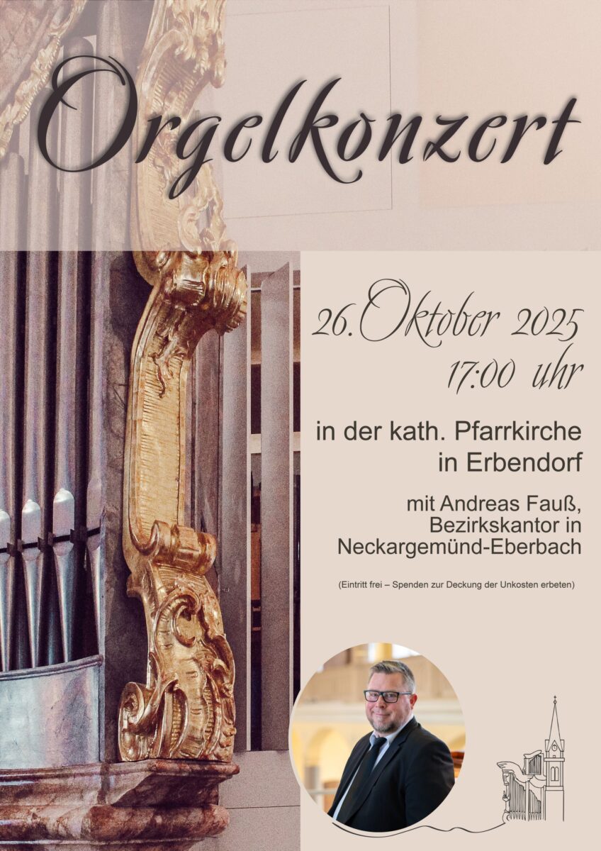 Am Sonntag, 26. Oktober 2025, findet in der katholischen Kirche ein Orgelkonzert statt. Zu Gast an der Voit-Konzertsaalorgel ist Andreas Fauß aus Eberbach.