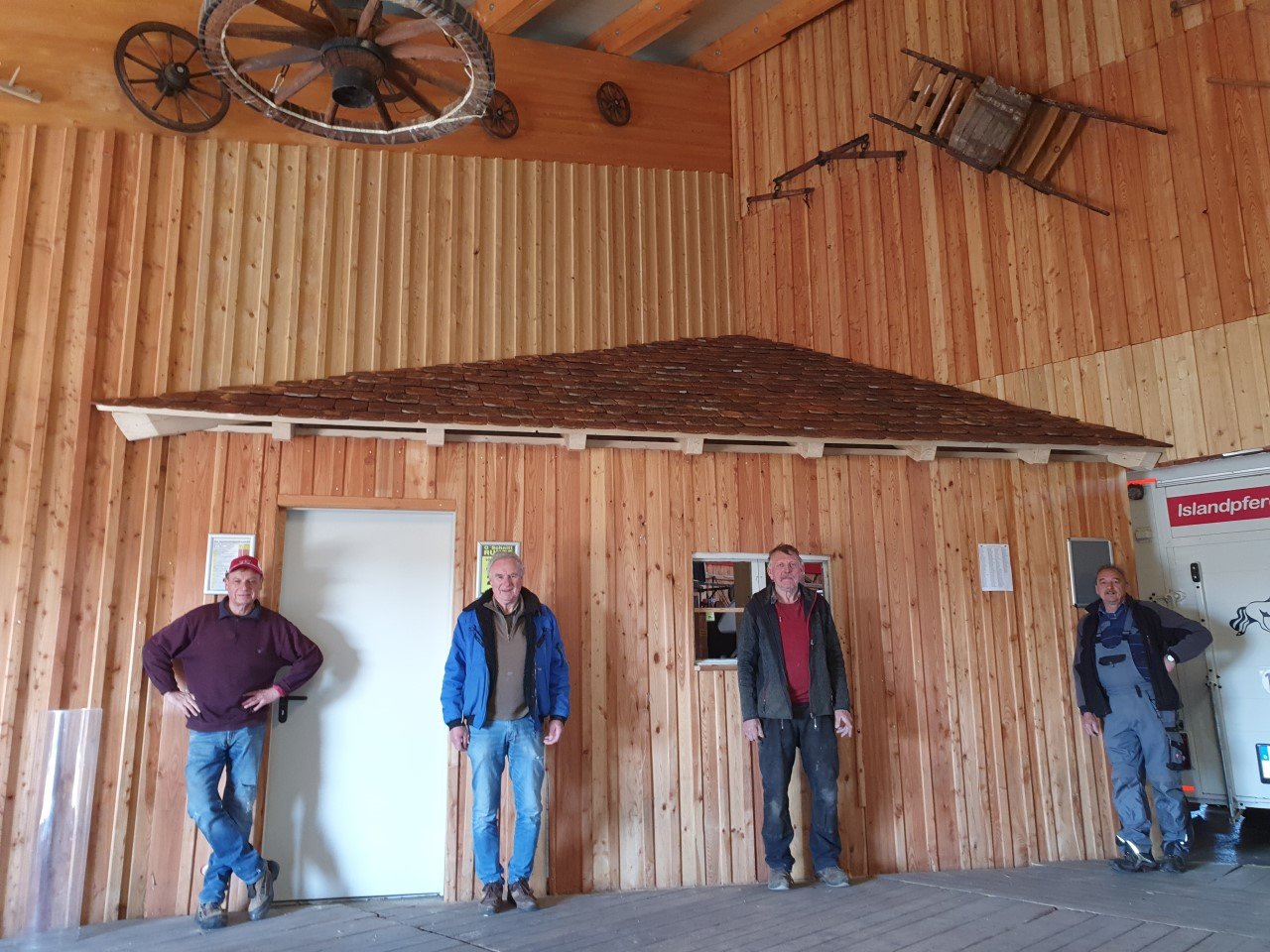 Unter der Federführung von Franz Witt verschönerten die Wurzer Hogerer die kleine Halle. So baute man ein Deko-Dach mit Biberschwänzen ein. Dazu ein passendes Fenster im unteren Bereich, vergleichbar mit einer Apre-Ski-Hütte.