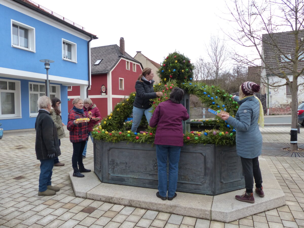 Frauen vom Evangelischen Frauenkreis und vom Katholischen Frauenbund, aber auch sonstige Frauen, sie nennen sich die „Osterfrauen“ haben sich der Aufgabe des Osterbrunnen-Schmückens angenommen. Die Federführung liegt in den Händen der Gemeindesekretärin Sabine Hengl. Für die Ergänzung der benötigten Ostereier, immerhin über 500 Stück, bließ Hengl alle Eier selbst aus. Die Eier wurden alle bemalt und in vielen Arbeitsstunden die Krone mit Grünzeug geschmückt.