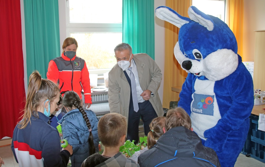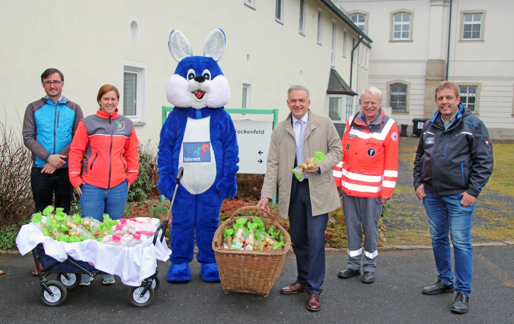 Organisiert von Jürgen Kreuzer, der am Landratsamt für den ÖPNV zuständig ist, besuchte ein Osterhase die Kinder und Jugendlichen und überbrachte 100 Schoko-Osterbeutel und 70 Osterbrote. Unterstützt wurde er dabei von Landrat Roland Grillmeier und dem BRK Kreisverband Tirschenreuth.