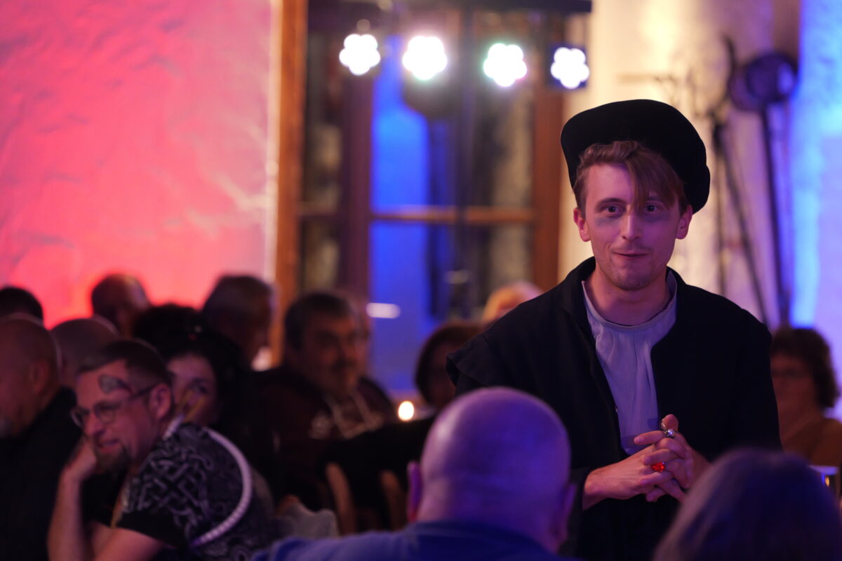 Die Schauspieler tummelten sich direkt inmitten der Zuschauer, nahmen Platz und aßen, tranken, unterhielten sich wie alle anderen Gäste auch – in ihren Rollen, versteht sich. Die Gäste wurden in das Jahr 1971 und in die slowakischen Karpaten transportiert, wo sie sich auf Schloss Schächtitz wiederfanden – ein imposantes und mythenumranktes Ensemble.