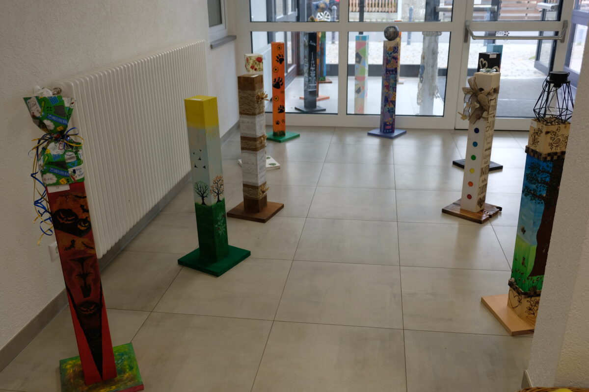 Es sind echte Hingucker in jedem Garten, für jede Terrasse und für jede Wohnung, ein Blickfang aus Holz, 90 Zentimeter hoch und robust genug, auch Wind und Wetter standzuhalten – Skulpturen, bei denen die Kinder aus Speinshart und weit über die Gemeindegrenzen hinaus ihre originellen Ideen verwirklichen konnten. Die Roh-Stelen aus massivem Kantholz mit Bodenplatten, vorgeschnitten von der Zimmerei Neukam in Zettlitz, von Hand bemalt, Unikate mit einem Hauch von Fantasie und Humor, bringen Farbe in die Häuser und Gärten.