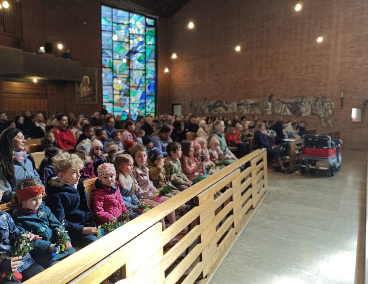 Ein herausstechender Moment war der individuelle Segen, den Pfarrer Jeschner jedem Kind beim Kommunionempfang erteilte. Am Ende des Gottesdienstes bat der Pfarrer die Kinder, die gesegneten, selbstgemachten Palmbuschen hochzuheben. Er ermutigte sie, damit zuhause das Kreuz zu schmücken und sich das ganze Jahr über an den Einzug des Herrn in Jerusalem zu erinnern.