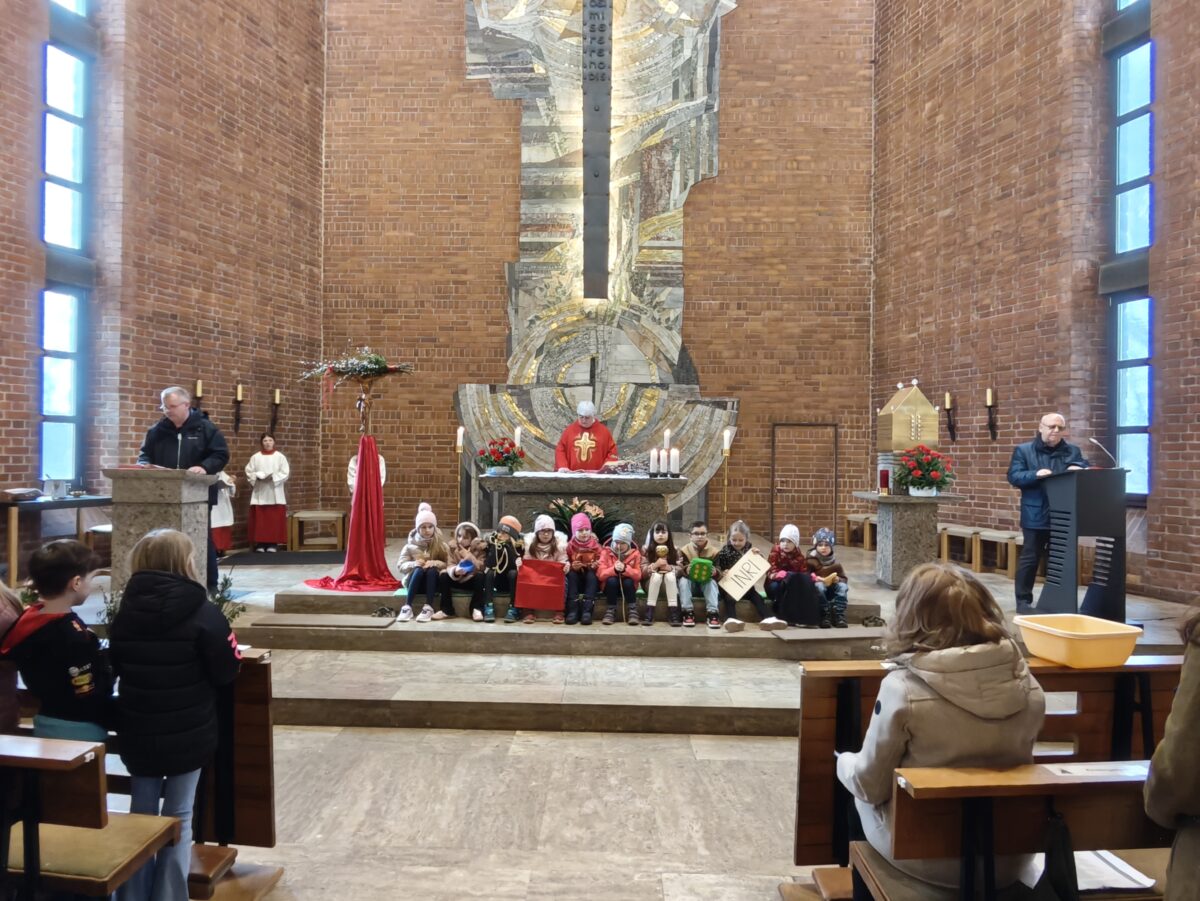 Dort wurde die Passionsgeschichte vom Leiden und Sterben Jesu Christi besonders anschaulich durch die Kinder der Kindergärten St. Elisabeth und Maria Waldrast dargestellt. Passend zu den einzelnen Abschnitten zeigten sie symbolisch Gegenstände wie die Dornenkrone, einen Kelch und weitere Zeichen des Leidensweges. So wurde die Passion für alle Mitfeiernden greifbar, kindgerecht und eindrucksvoll erlebbar. Zahlreiche Erstkommunionkinder nahmen an der Feier teil, trugen die Fürbitten vor und machten den Gottesdienst zu einem besonderen Erlebnis für die ganze Gemeinde.