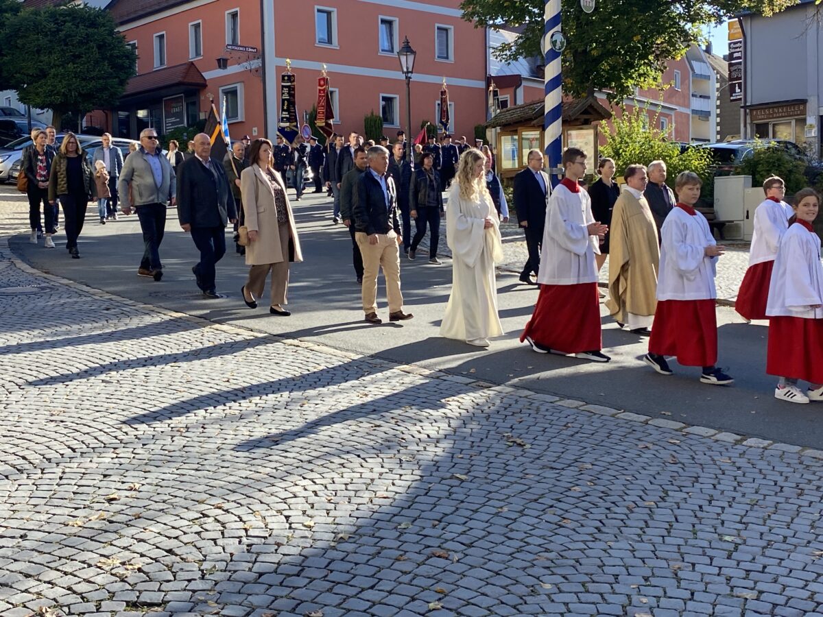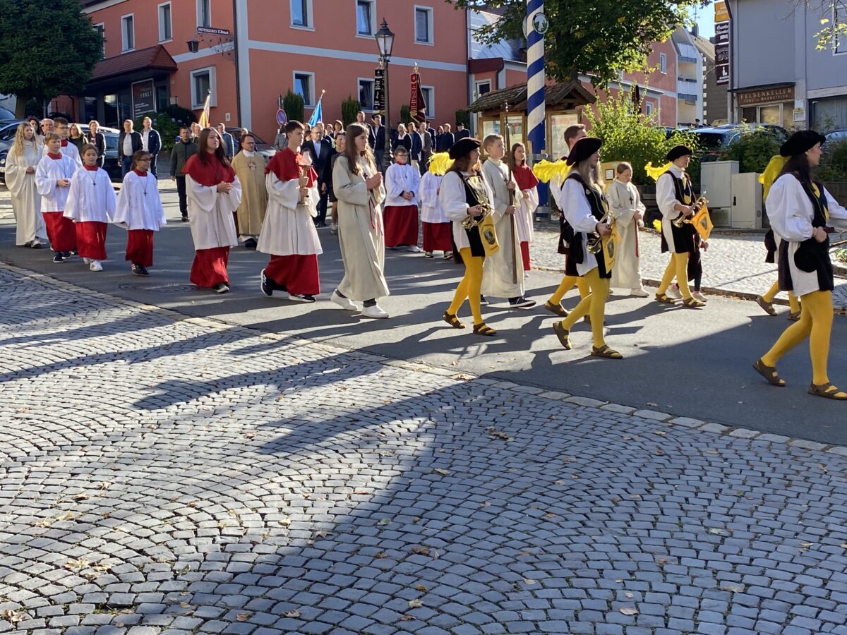Traditionsgemäß führte die Kolpingfamilie Tännesberg mit Pauken und Trompeten den Kirchenzug mit Dekan Alexander Hösl und den Ministranten an, der sich vom ehemaligen Forstamt zur Pfarrkirche bewegte. Die Vertreter der Gemeinde mit dem Ersten Bürgermeister Ludwig Gürtler und den Räten, sowie Fahnenabordnungen der örtlichen Vereine ließen es sich nicht nehmen, die Verbundenheit mit unserer Pfarrkirche zu zeigen, die sich den Anführer der himmlischen Heerscharen, Erzengel Michael, als Patron wählte.